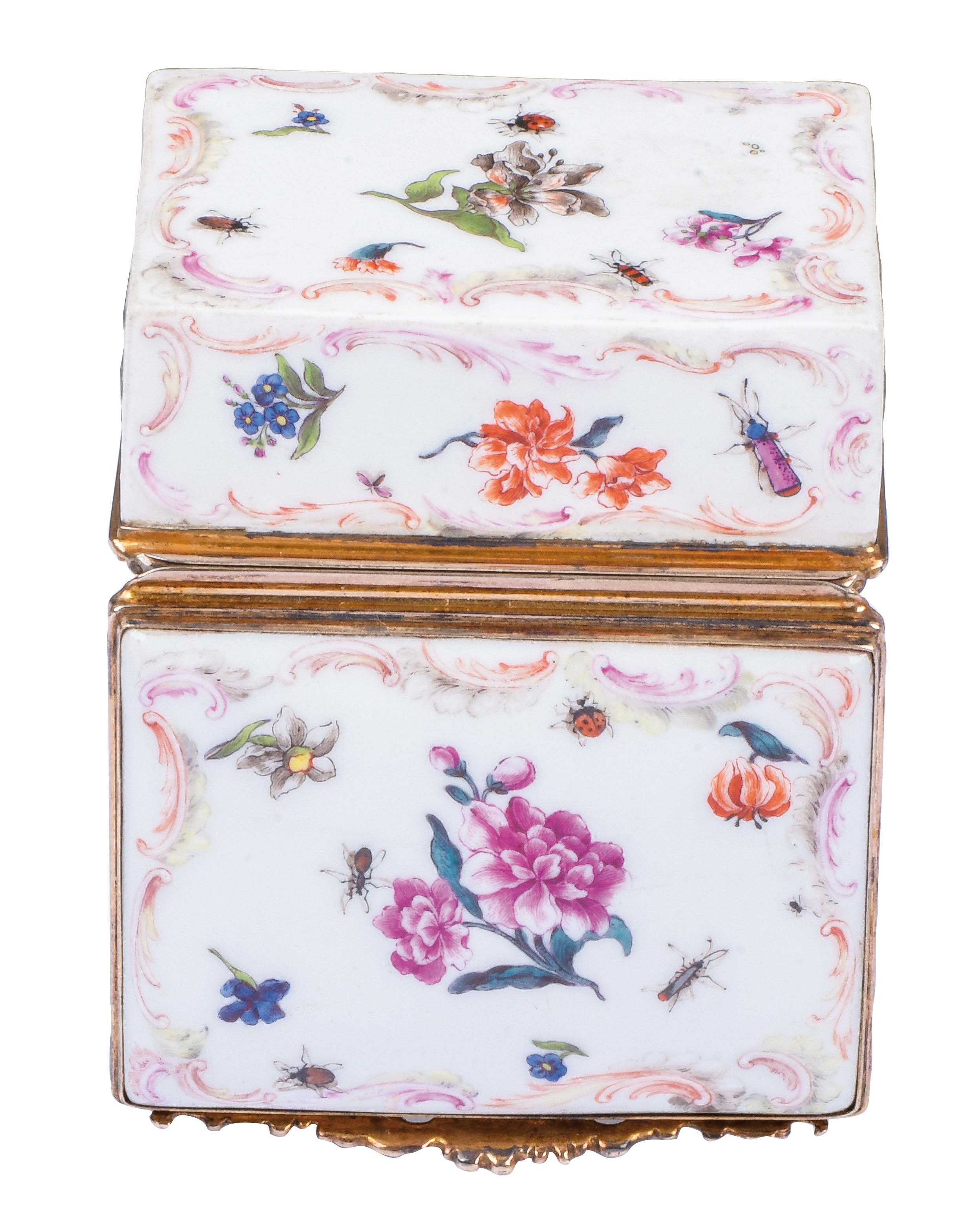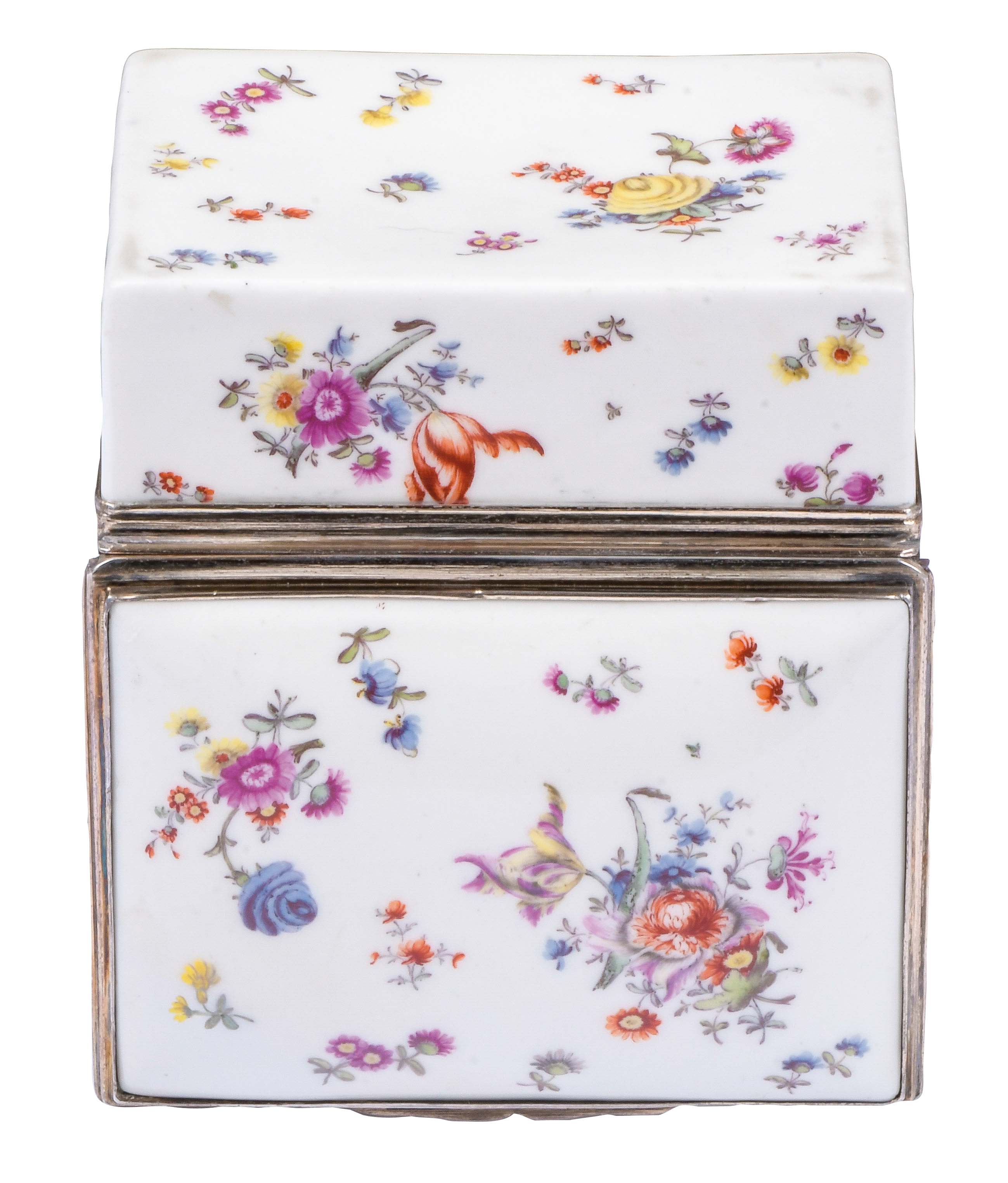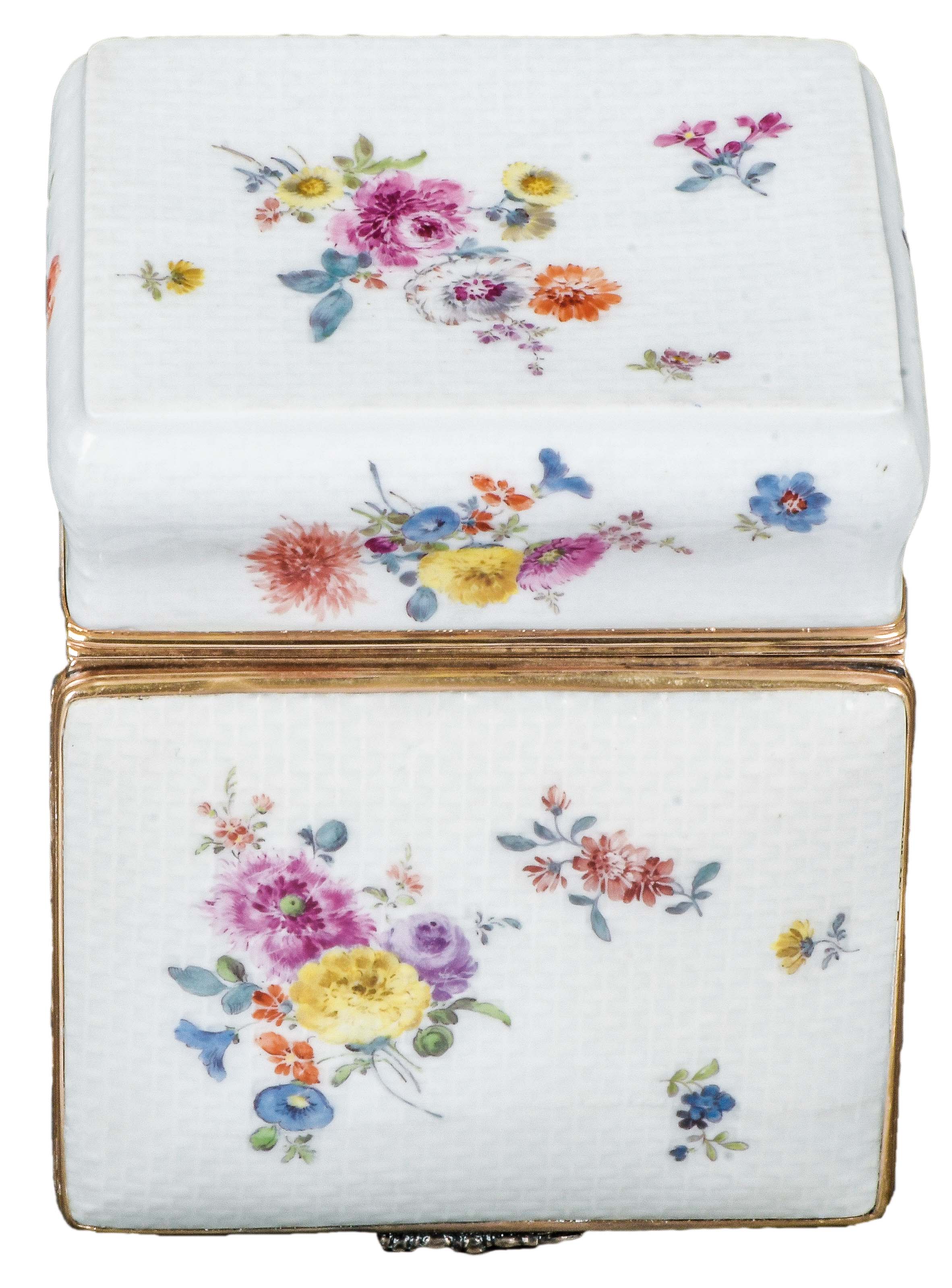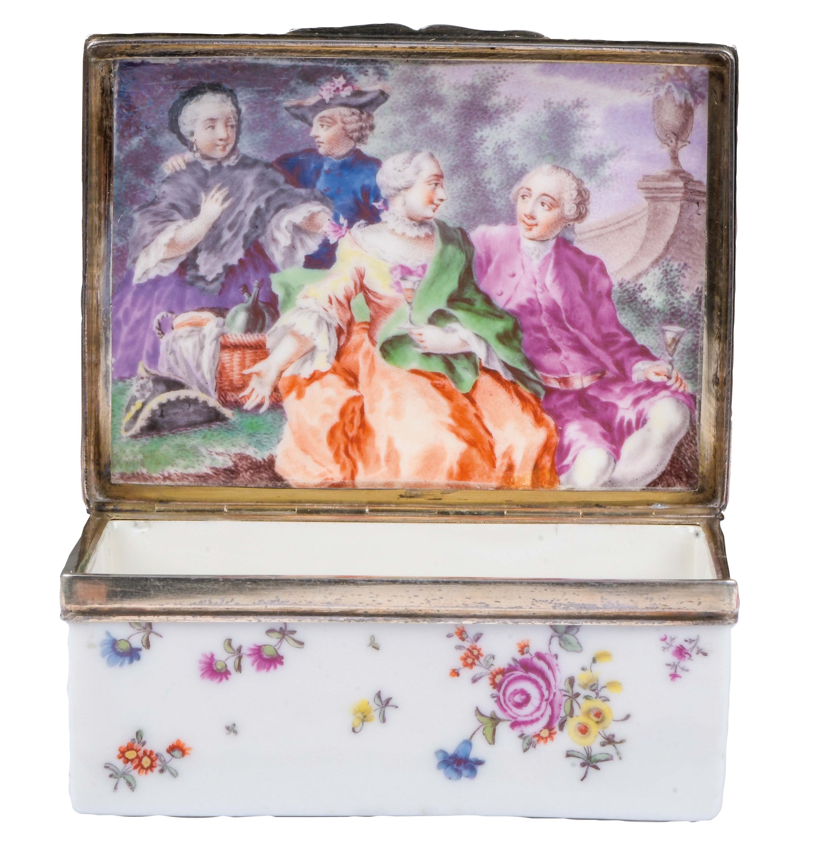 Frankenthal 1765 Rechteckig, mit nach oben zu öffnendem Deckel, verbunden durch vergoldete Silbermontur. Außenflächen bunt bemalt mit Blumenbouquets, umgeben von Streublumen. Innendeckel exzellent bunt bemalt mit galanter Szene. Porzellan, ohne Marke. Malerei von Jacob Osterspey. Provenienz: Gerhard Röbbig, München 2000. H=3,7 cm, B=9,2 cm, T=7,1 cm € 3.800,- - Katalog-Nr: 46Seltene Tabatière „à Cage“
