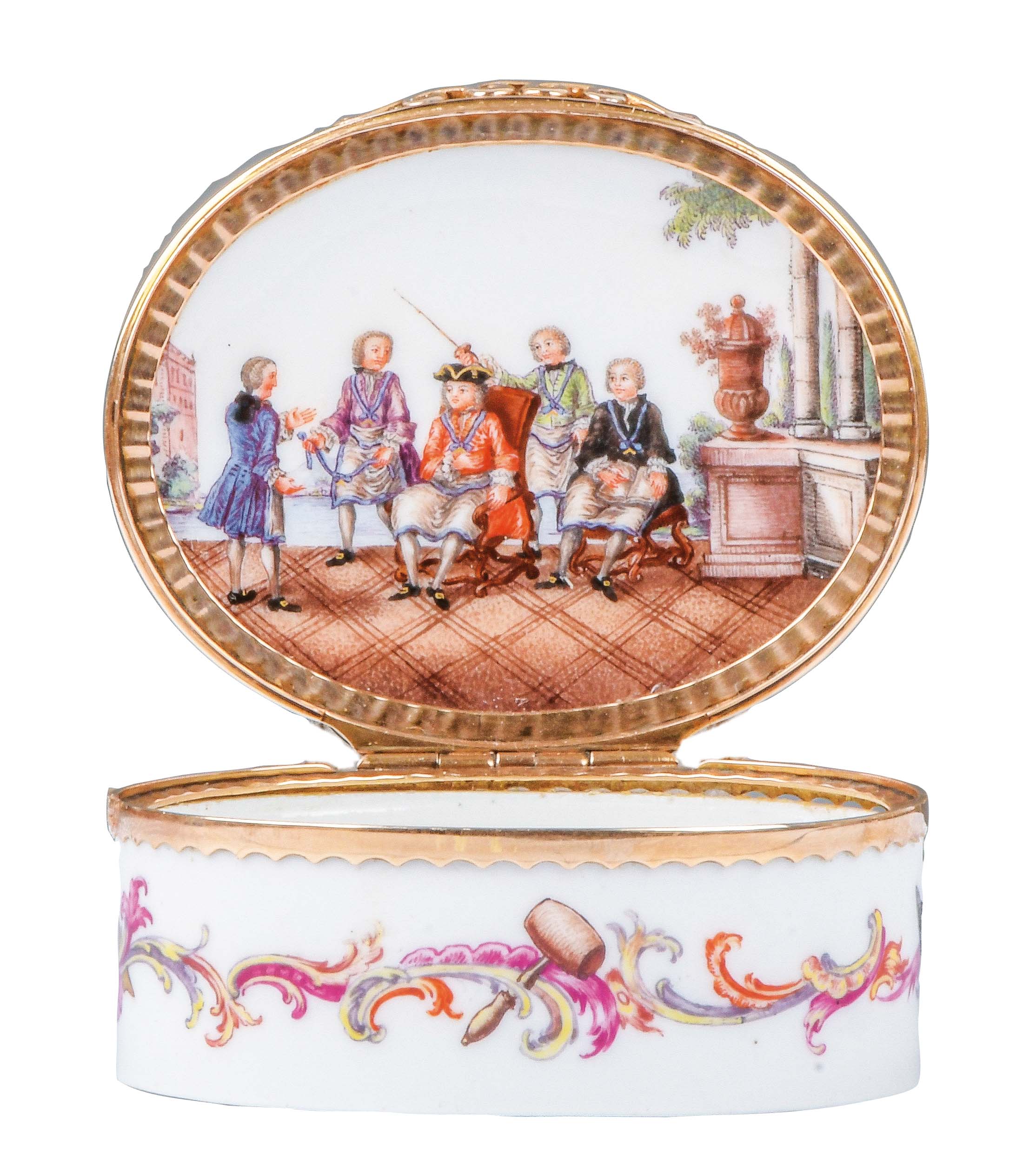Meissen 1750-60 Oval, mit nach oben zu öffnendem Deckel, verbunden durch Goldmontur. Außenflächen bunt bemalt mit Freimaurersymbolden und Beschriftung. Innendeckel bunt bemalt mit Szene der Johannisloge: Mitglieder er drei Graden-Lehrling-Geselle-Meister arbeitenden Johannisloge. Am Boden mit der Darstellung und den Hinweis auf die Bibel mit der Offenbarung des Johannes. Porzellan, ohne Marke. Provenienz: Slg. C.W. Harris, Isle of Man. Vgl. B. Beaucamp-Markowsky, S. 136, Nr. 101 (id. Abb.). H=2,7 cm, B=5,8 cm, T=4,9 cm € 8.000,- - Katalog-Nr: 36Tabatière