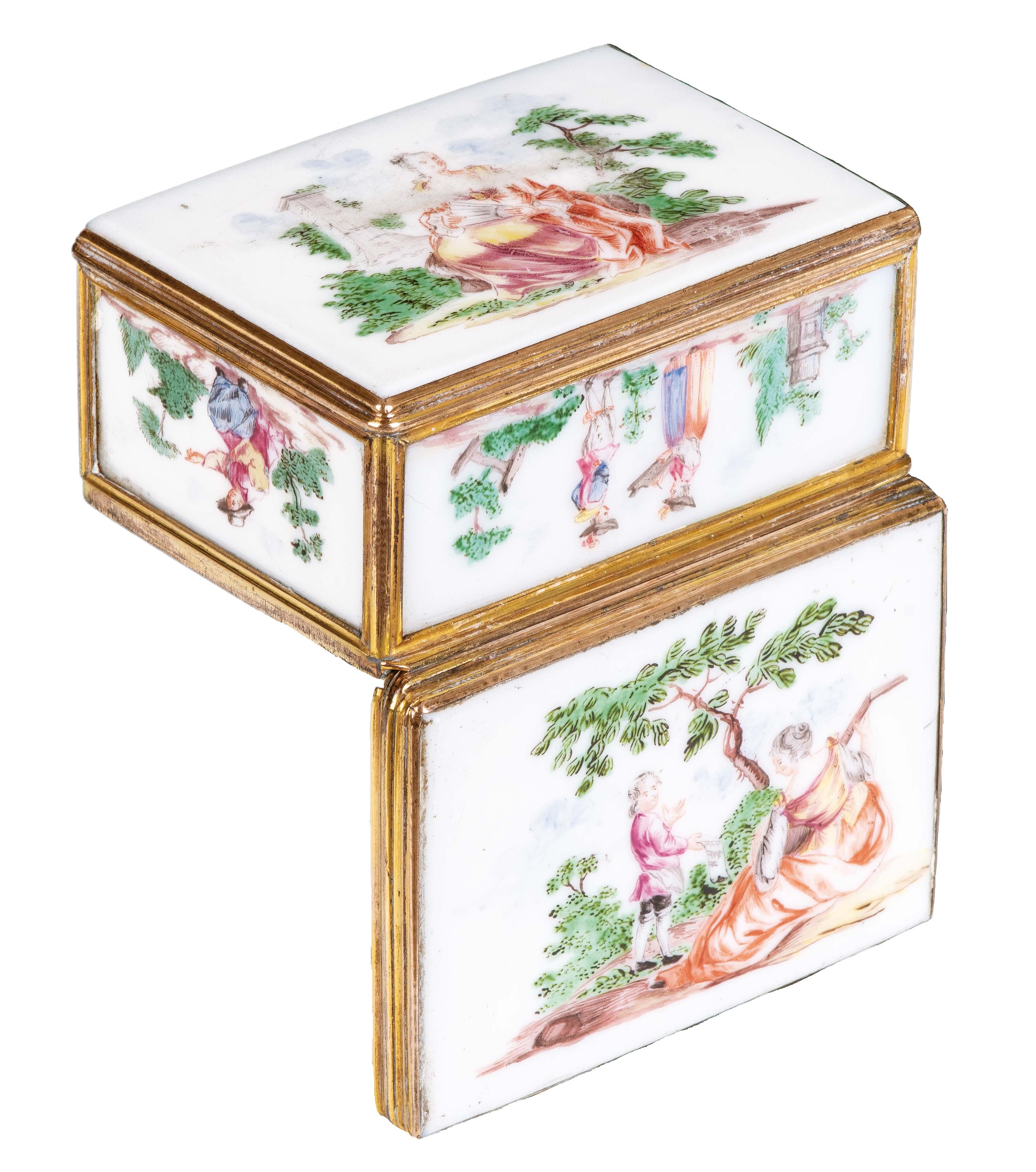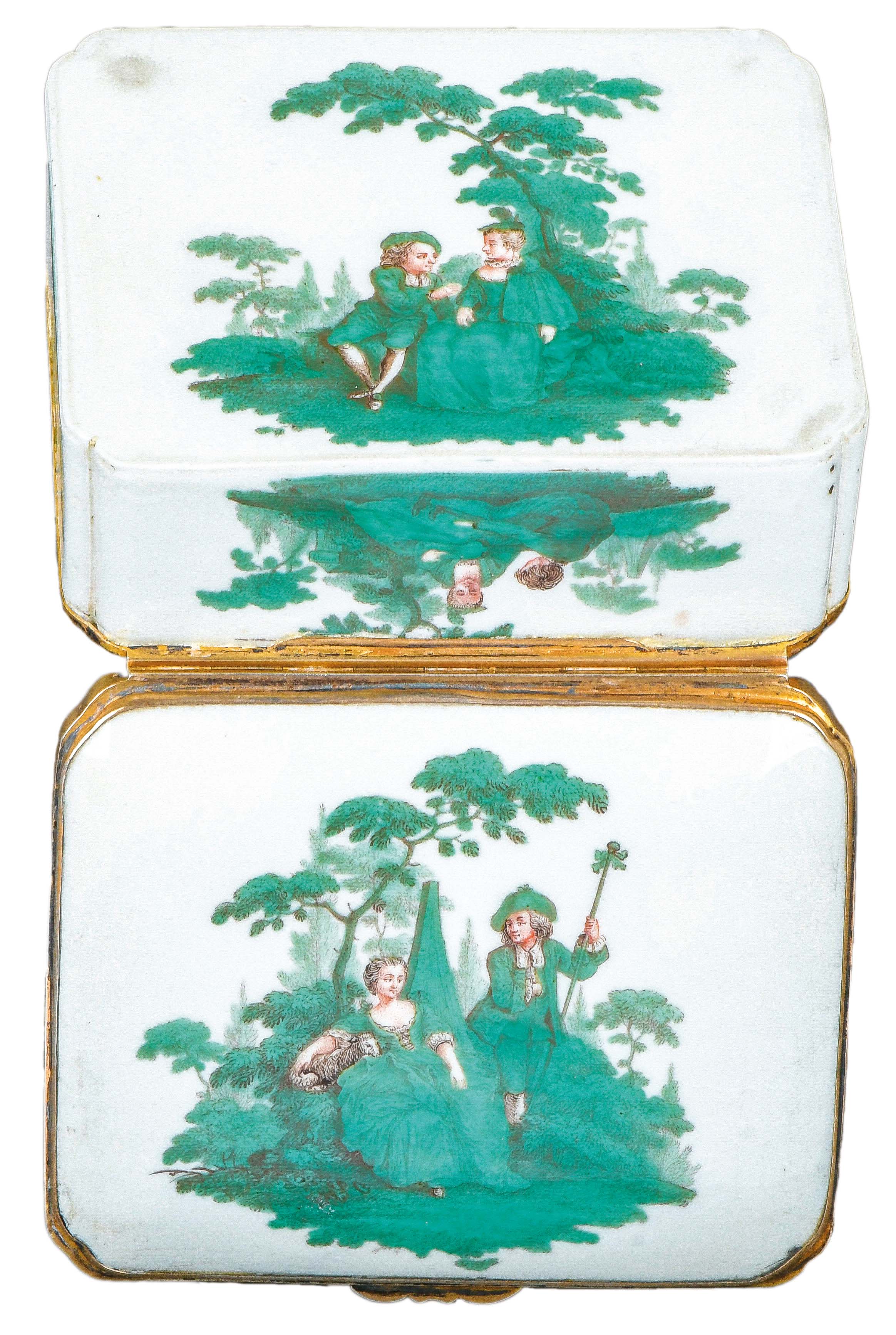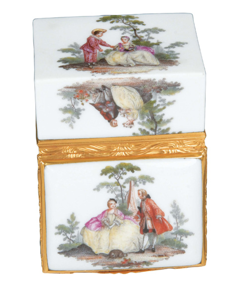 Meissen 1745-50 Rechteckig, mit nach oben zu öffnendem Deckel, verbunden durch vergoldete Montur. Außenflächen und Innendeckel kupfergrün bemalt mit Watteauszenen, Gesichter und Arme fleischfarben bemalt, Innenboden gold gehöht. Porzellan, ohne Marke. Vgl. Barbara Beaucamp-Markowsky, S. 128, Nr. 97 (für das Modell) und S. 94, Nr. 65 (für die Malerei). H=3,8 cm, B=8,7 cm, T=7,3 cm € 4.000,- - Katalog-Nr: 38Tabatière