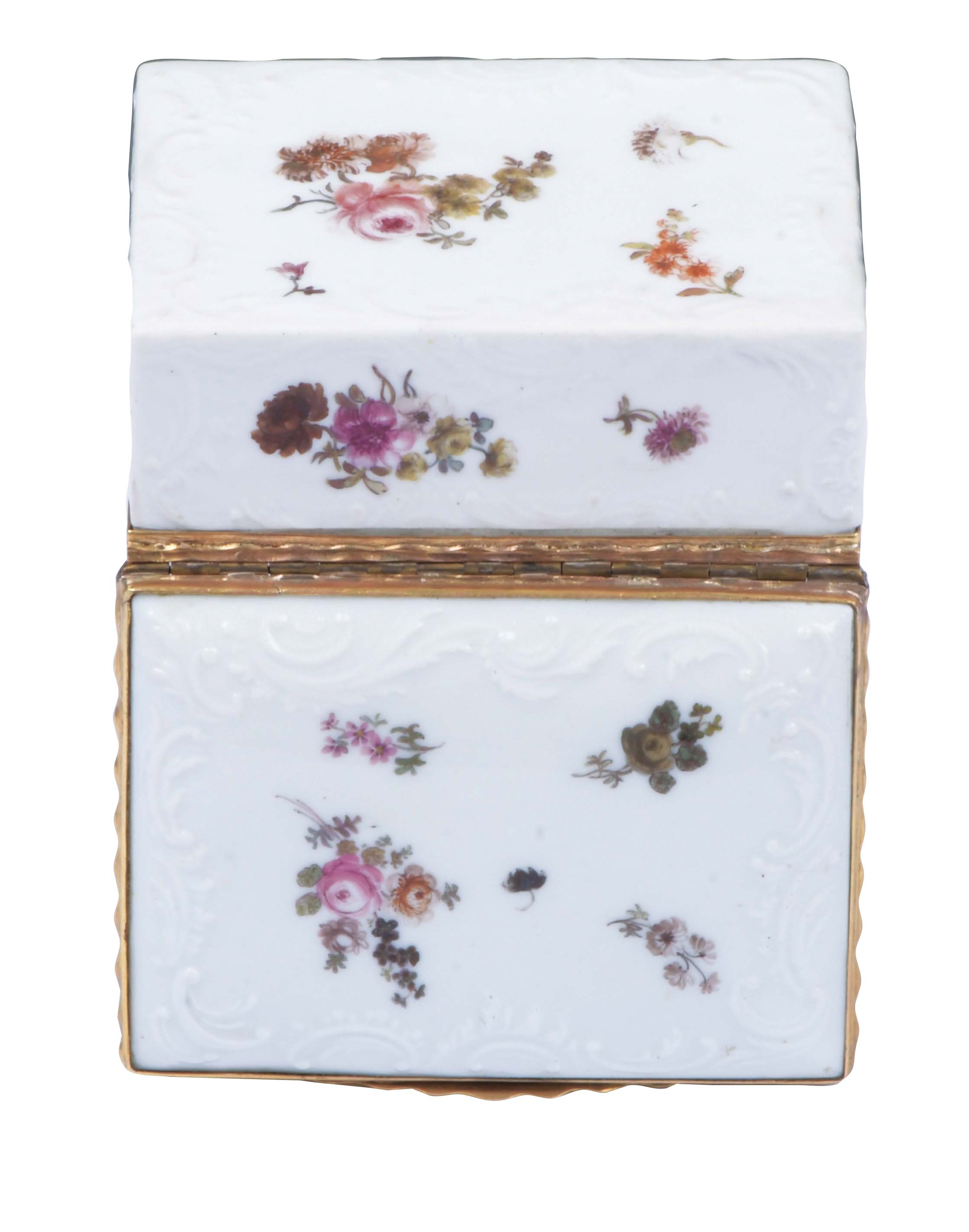 Meissen 1735 Rechteckig, mit nach oben zu öffnendem Deckel, verbunden durch Goldmontur, teilweise ziseliert. Außenflächen mit Korbflechtrelief und bunt bemalt mit Floraldekor. Innendeckel exzellent bunt bemalt mit dem Porträt August III. Porzellan, ohne Marke. Malerei von Johann Heinrich Heinrici. (feiner Haarriss im Deckel). H=3,5 cm, B=8,3 cm, T=6,6 cm € 6.000,- - Katalog-Nr: 45Tabatière