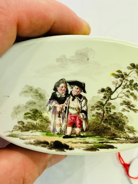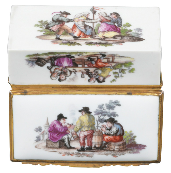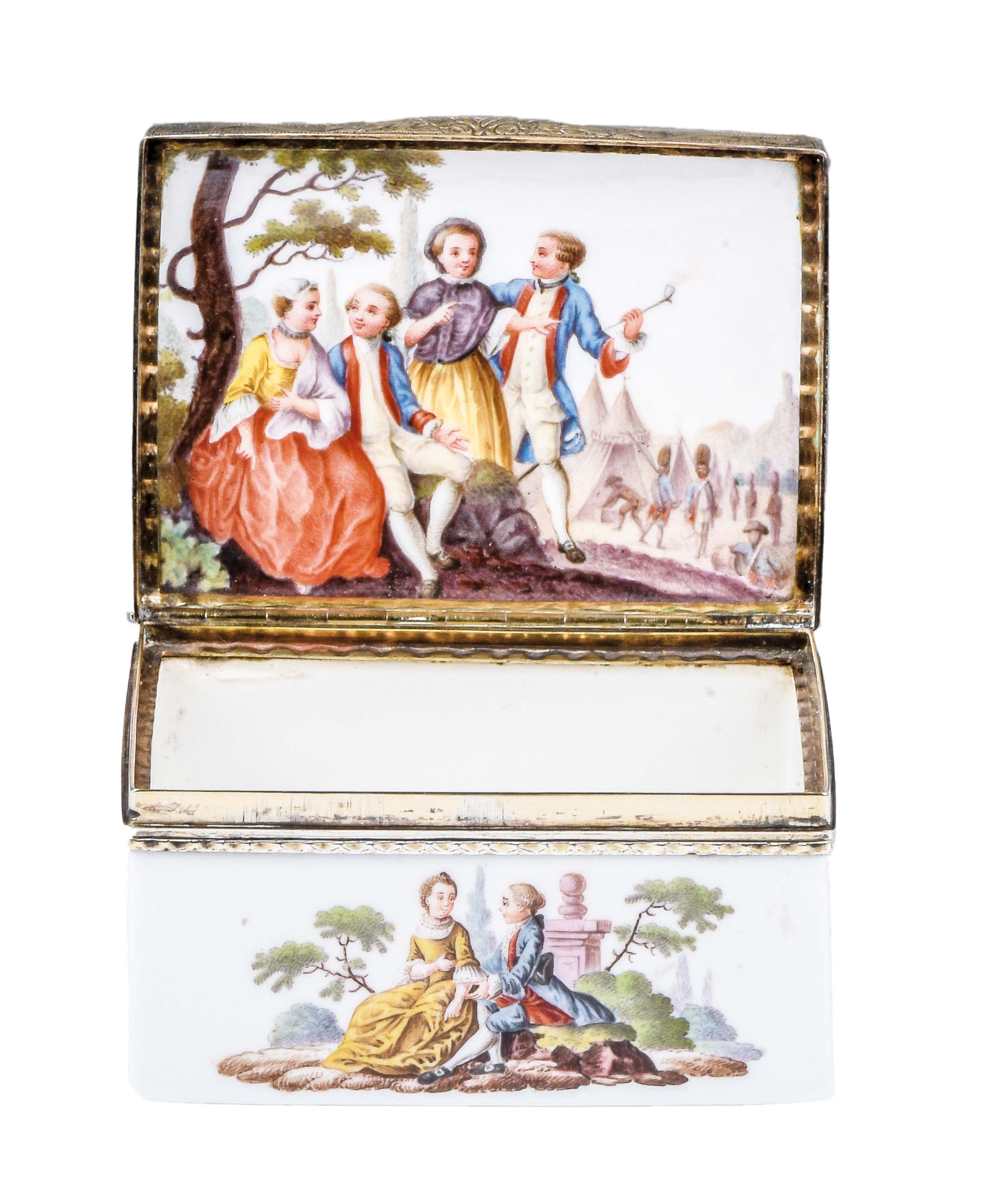 Fürstenberg 1760 Rechteckig, mit nach oben zu öffnendem Deckel, verbunden durch vergoldete, ziselierte Montur. Außenflächen bunt bemalt mit galanten bzw. Komödienszenen. Innendeckel bunt bemalt mit zwei Offizieren, zwei Marketenderinnen sowie einem Zeltlager mit Soldaten im Hintergrund. Porzellan, ohne Marke. Malerei wohl von Louis Victor Gerverot. H=4,8 cm, B=7,8 cm, T=5,8 cm € 3.600,- - Katalog-Nr: 42Tabatière