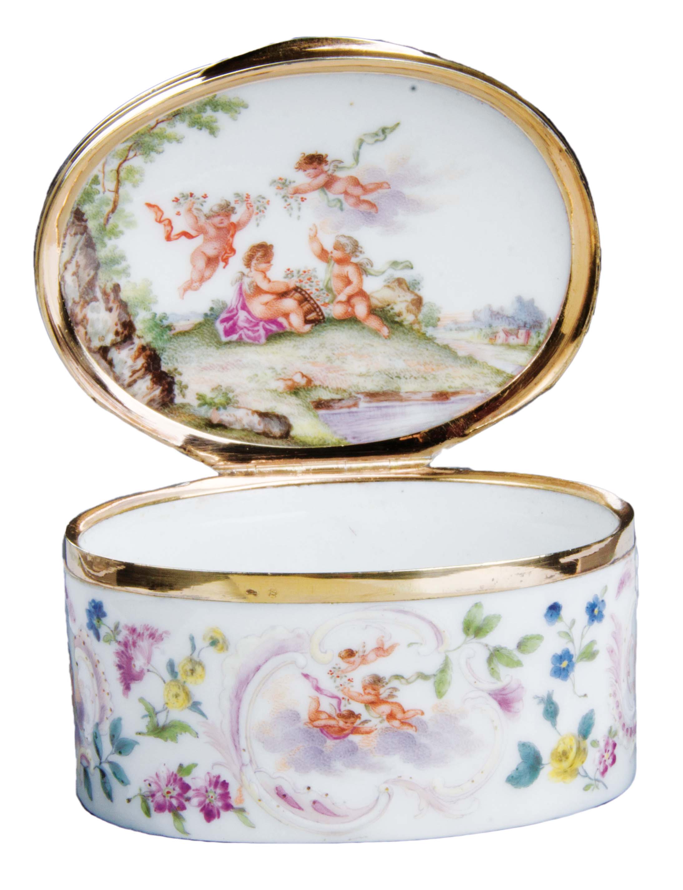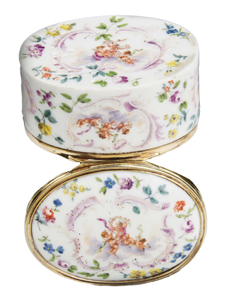Meissen 1750 Oval, mit nach oben zu öffnendem Deckel, verbunden durch Goldmontur. Außenflächen mit rocaillereliefierten Kartuschen, floral gesäumt. Reserven und Innendeckel bunt bemalt mit auf Wolken schwebenden Putten bzw. in Landschaft. Porzellan, ohne Marke. Provenienz: Kunsthandel Röbbig, München. Vgl. B. Beaucamp-Markowsky, S. 212, Nr. 168. H=4,7 cm, B=8,2 cm, T=6,6 cm € 4.000,- - Katalog-Nr: 44Tabatière