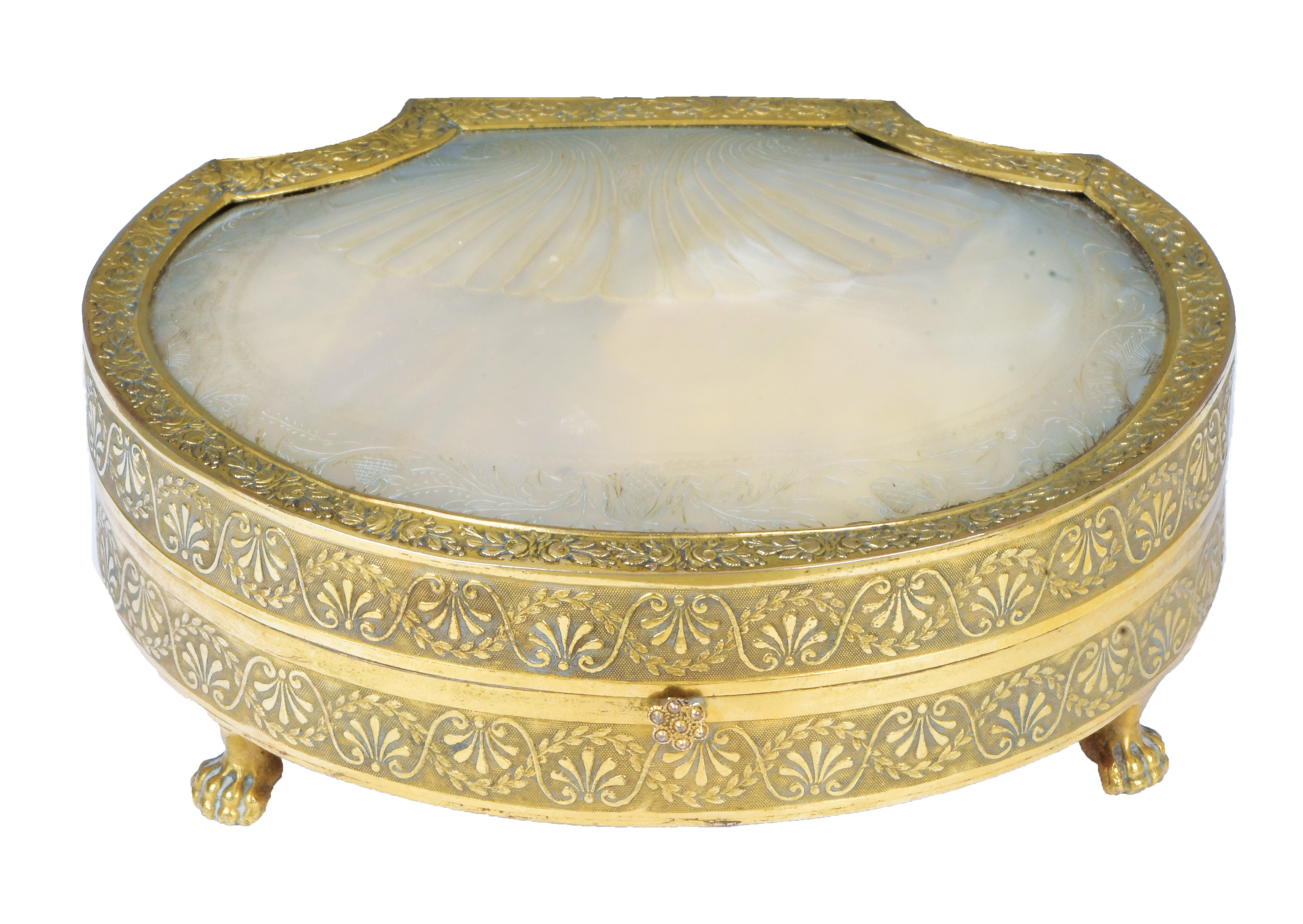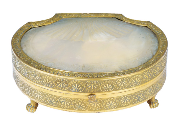 Wien 1820 Ovaler vergoldeter Messingkorpus auf Prankenfüßen. Wandung umlaufend mit Palmettblattrelief und teilw. ziseliert. Der nach oben zu öffnende Deckel mit eingefasster, polierter und gravierter Muschel an der Außenseite und Spiegel an der Innenseite. Das Innenleben mit originaler Einteilung und Zubehör, bestehend aus: Eine Schere (8,6 x 4,3 cm), ein Spitzbohrer (L=9 cm), ein Einfädler (L=5,2 cm), ein Paar Garnrollen (H=2,3 cm, D=1,4 cm), eine Garnspule (D=2,2 cm), ein Fingerhut (H=2,3 cm), eine Nadelbüchse (H=6,4 cm, B=1,6 cm), drei Zahnstocher und ein Ohrlöffel. Alle Teile aus poliertem Perlmutt mit Goldmanschette und Medaillon. Mit Original-Schutzkissen. H=4,8 cm, B=12,8 cm, T=10,3 cm € 1.400,- - Katalog-Nr: 50Jagdtabatière