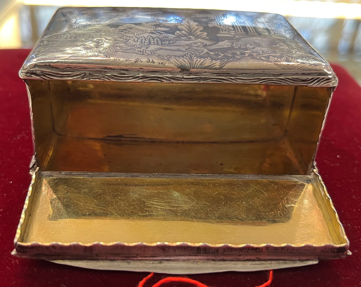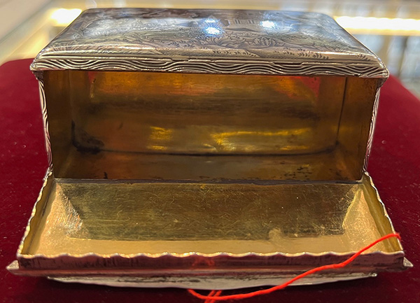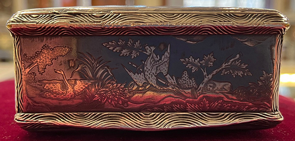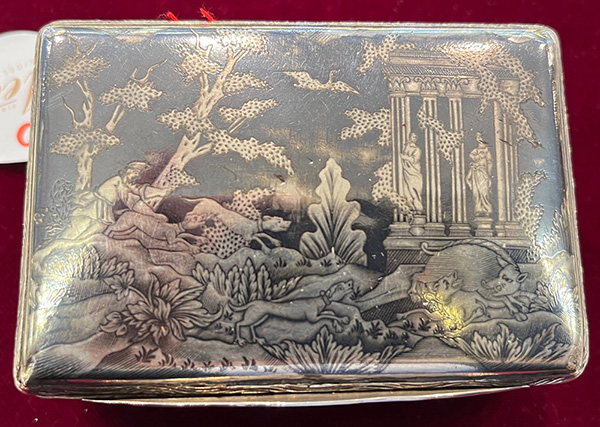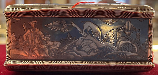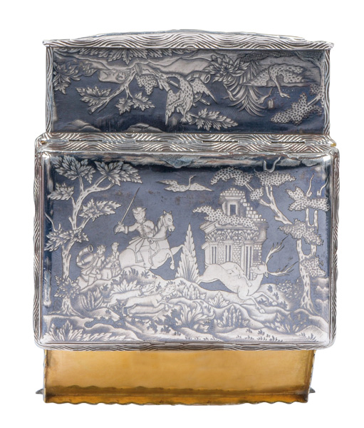 Wohl Augsburg um 1740 Rechteckig, mit aufklappbarer Vorder- und Rückseite. Silber, ca. 196 g, museal ziseliert und graviert mit Jagdszenen nach Johann Elias Riedinger in Niellotechnik; innen vergoldet und mit Trennwand versehen. H=4,4 cm, B=9 cm, T=6,4 cm € 5.000,-