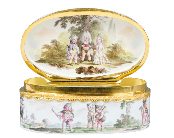 Berlin, Pierre Fromery um 1750 Oval, mit nach oben zu öffnendem Deckel, verbunden durch ziselierte und gravierte Goldmontur. Kupferkern, emailliert und farbig bemalt mit Kindern, als Erwachsene verkleidet, in Landschaft. Malerei von Daniel Chodowicki (1726-1801) nach Stichvorlagen von Aubert. H=3,9 cm, B=8,4 cm, T=4,9 cm € 3.000,- - Katalog-Nr: 30Tabatière