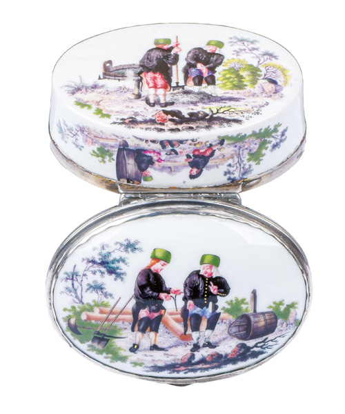 Meissen 1740-45 Oval, mit nach oben zu öffnendem Deckel, verbunden durch Silbermontur. Außenflächen und Innendeckel bunt bemalt mit Bergmannszenen in Landschaft. Porzellan, an der Innenwandung unterglasurblaue Schwertermarke. Malerei von Bonaventura Gottlieb Häuer. Provenienz: Christie's, London 1978; davor Slg. E. Pinkus, New York Mai 1966. Vgl. R. Slotta / G. Lehmann / U. Pietsch, „Ein fein bergmanning Porcelan“, Essen 1999, S. 338 (id. Abb.). H=3,6 cm, B=8 cm, T=6,4 cm € 6.000,- - Katalog-Nr: 37Tabatière