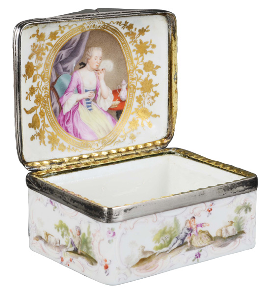 Meissen 1740 Rechteckig, mit nach oben zu öffnendem Deckel, verbunden durch Silbermontur. Außenflächen mit Rocaillekartuschen, zartrosa gesäumt. Reserven bunt bemalt mit Schäferszenen in Landschaft. Innendeckel mit aufwendigem Goldrahmen, floral gesäumt und teilweise radiert. Reserve bunt bemalt mit sitzender Dame beim Kaffeegenuss bzw. beim Kaltpusten des Kaffees in Unterschale. Porzellan, ohne Marke. Vgl. B. Beaucamp-Markowsky, S. 137, Nr. 102. H=4,4 cm, B=9 cm, T=7 cm € 3.000,- - Katalog-Nr: 40Tabatière