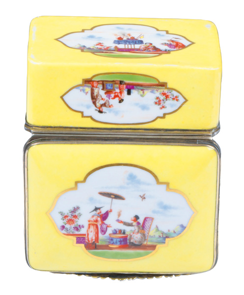 Meissen um 1735 Rechteckig, mit nach oben zu öffnendem Deckel, verbunden durch vergoldete Silbermontur. Außenflächen mit zitronengelbem Fond und mehrpassigen, gold gesäumten Aussparungen. Reserven und Innendeckel bunt bemalt mit Chinoiserien. Innenwandung und Boden des Unterteils gold gehöht. Porzellan, ohne Marke. Malerei von Johann Gregorius Hoeroldt. Vgl. Schulz-Codex, Taf. 84; Vgl. B. Beaucamp-Markowsky, S. 51, Nr. 22. H=4,4 cm, B=9,4 cm, T=7,8 cm € 8.000,- - Katalog-Nr: 43Tabatière