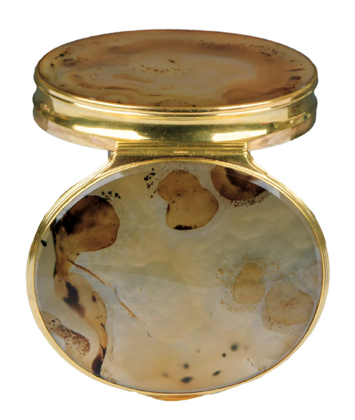 England 1730 Oval, mit nach oben zu öffnendem Deckel, verbunden durch Goldmontur. Deckel und Boden aus poliertem Achat. H=1,9 cm, B=7,8 cm, T=6,7 cm € 3.000,- - Katalog-Nr: 49Bedeutende Prunknähschatulle