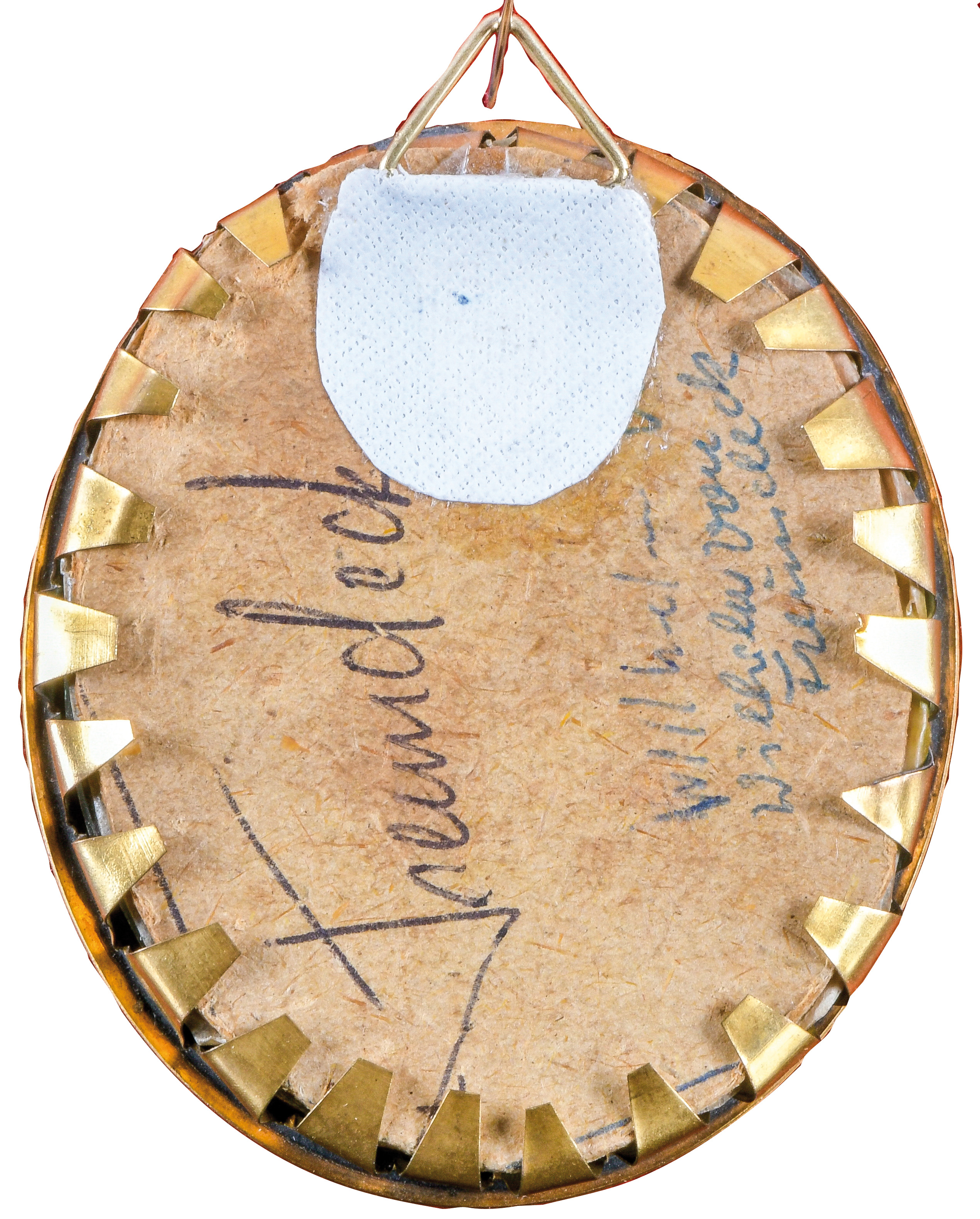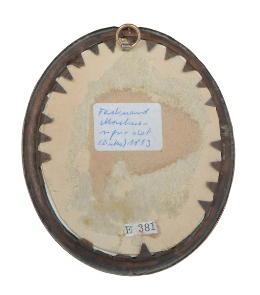 Porträt von Wilhelm von Freundeck. Bunt gemalt in Puderfarben und aquarelliert auf Elfenbeinplatte, hi./Gl. in vergoldetem, teilw. ziseliertem Messingrahmen. Provenienz: Antiquitäten Karl-Friedrich Schulz, Mannheim 1982. Elfenbein-Gutachten und EU-Verkaufsgenehmigung liegen vor und können für EUR 150,00 erworben werden.