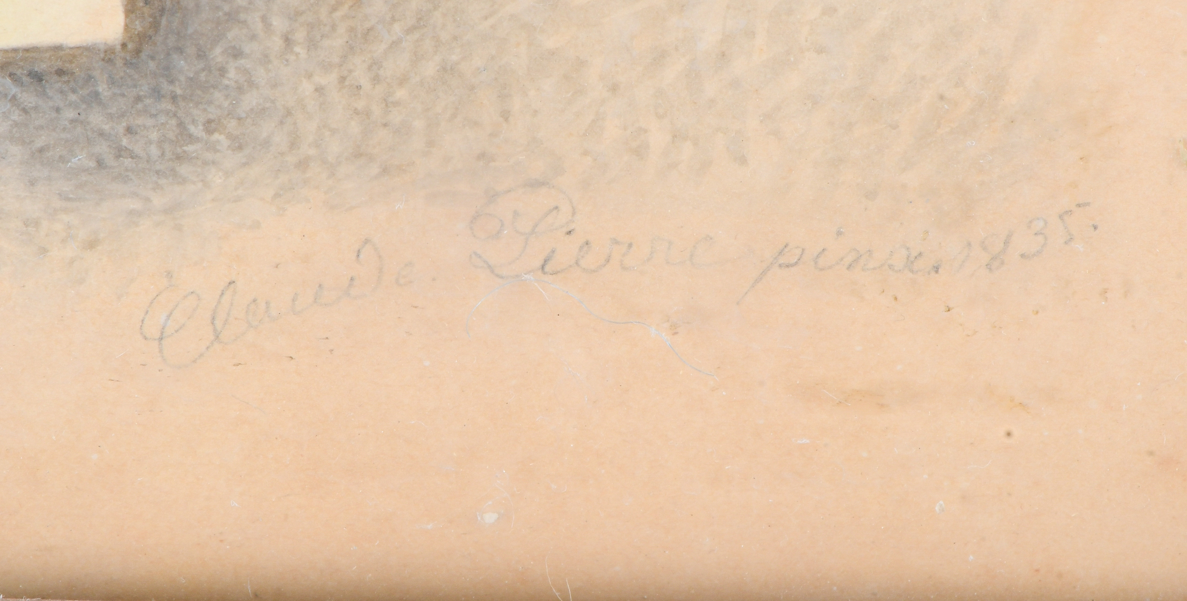 Kinderporträt von Claude Pierre im Alter von 1 1/2 Jahren. Bunt aquarelliert auf Papier, re./u./sign./dat. 1835, hi./Gl. in breitem, teilw. ebonisiertem Holzrahmen. Provenienz: Antiquitäten Gertrud Rudigier, München 1981.