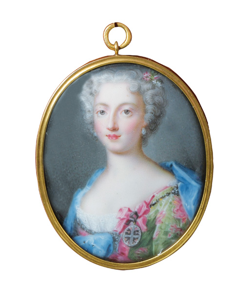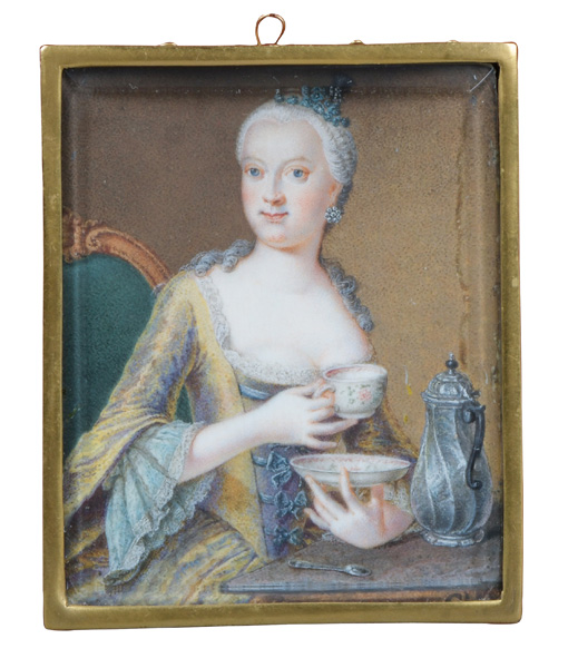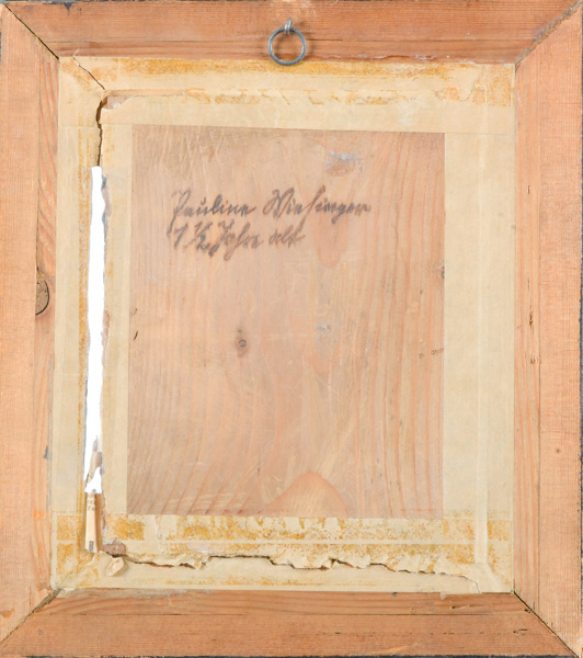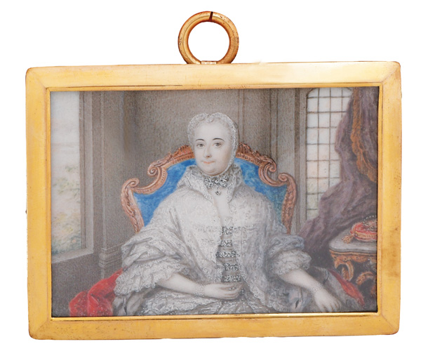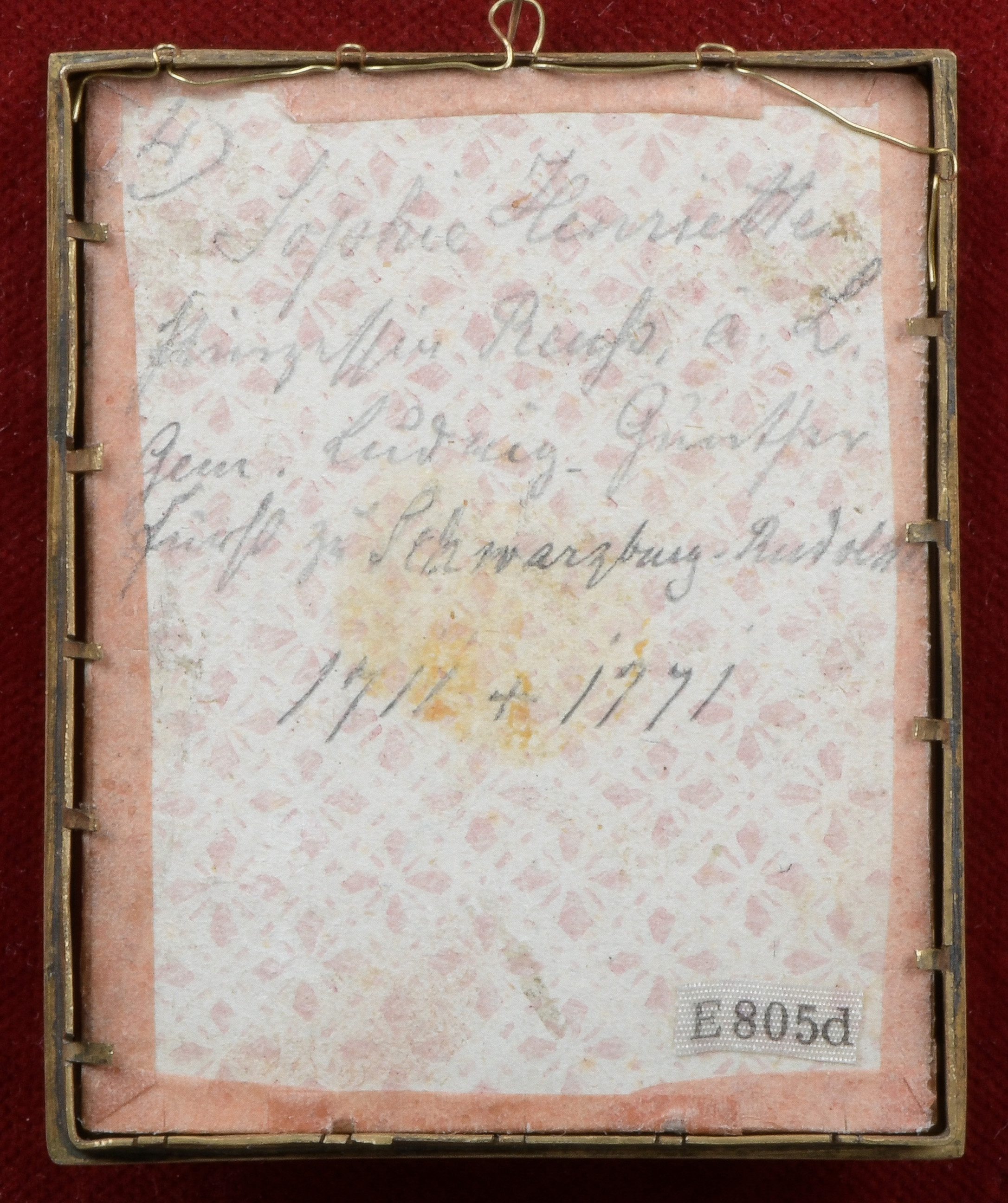 Porträt der Prinzessin Sophie Albertina von Schwarzburg-Rudolstadt (1724-1799). Bunt gemalt in Puderfarben und aquarelliert auf Pergament, hi./Gl. in schichtem, poliertem Messingrahmen. Provenienz: Sotheby's, London 15. Nov. 1982.