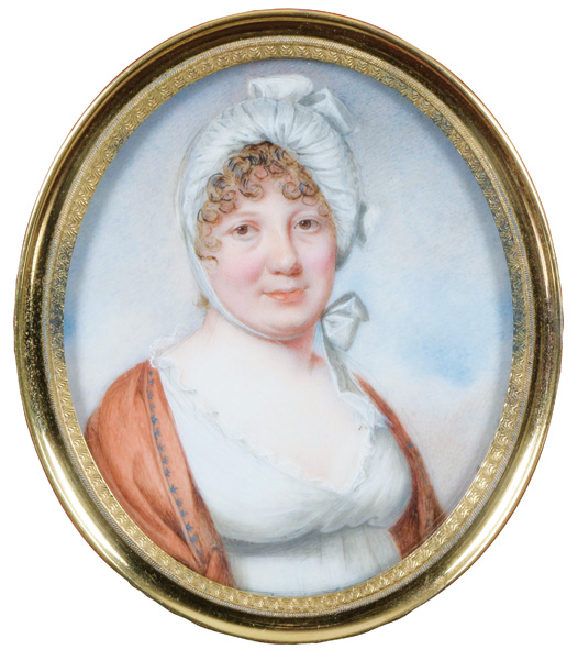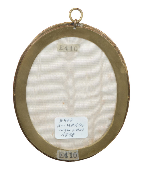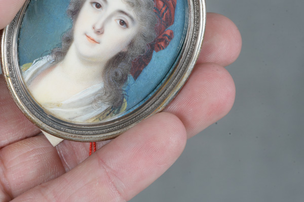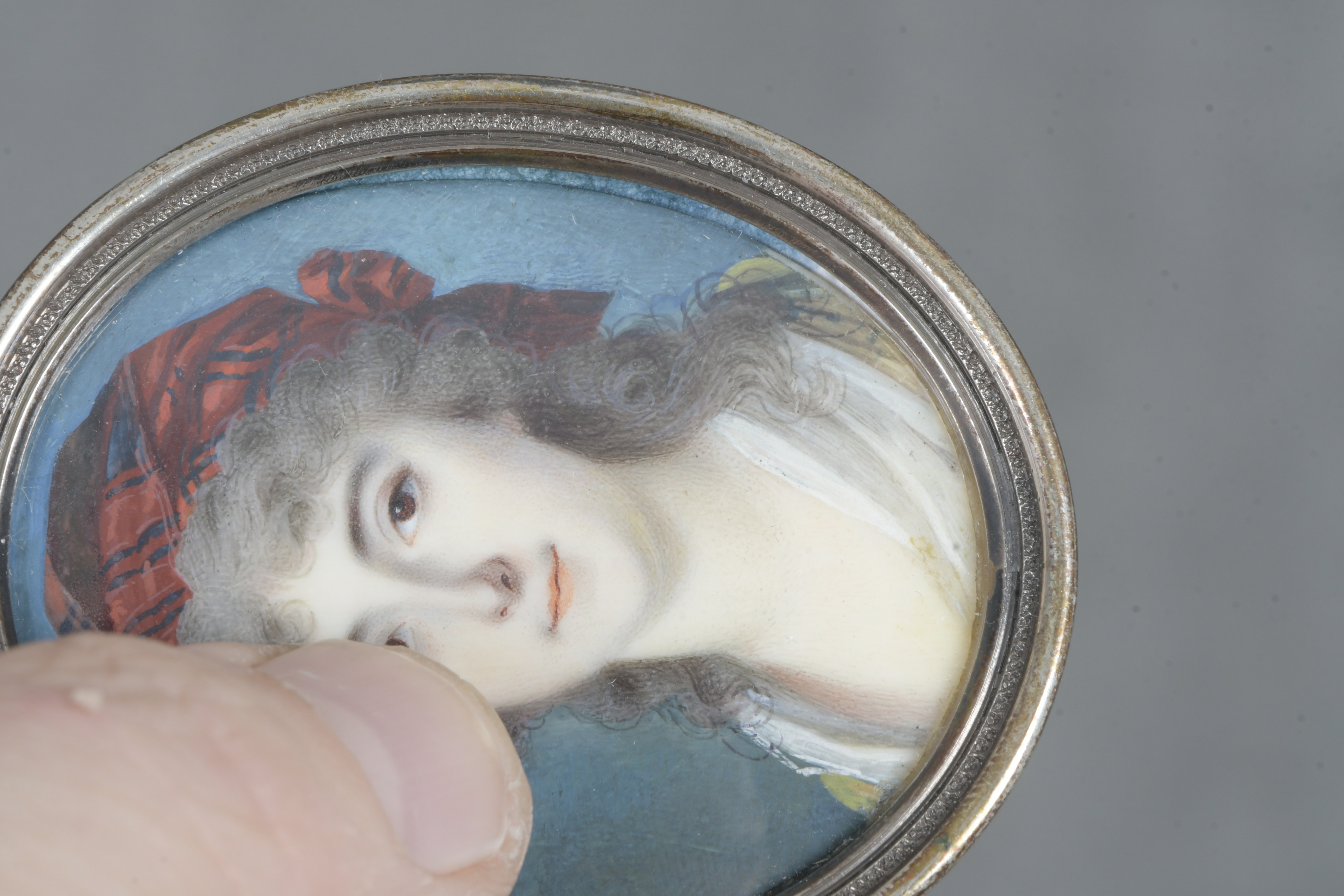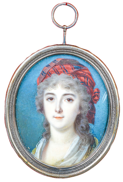 Porträt der Madame Tallien (1773-1835). Bunt gemalt in Puderfarben und aquarelliert auf Elfenbeinplatte, re./mittig/sign., hi./Gl. in aufwendig profiliertem Silberrahmen, verso zusammengefaltetes Schreiben. Provenienz: Slg. Ernst Holzscheiter, Meilen; Sotheby's, London 28. März 1977; Christie's, London 6. Juli 2005 für GBP 8.000,00. Ausstellung: Napoleonmuseum, „Miniaturen und Karikaturen“, Arenenberg 1954, Kat.-Nr. 34 (Leihgabe von E. Holzscheiter, Meilen). Vgl. H. Rieben, „Portraits en miniature“, Bern 1952, Abb. Tafel 10. Elfenbein-Gutachten und EU-Verkaufsgenehmigung liegen vor und können für EUR 150,00 erworben werden.