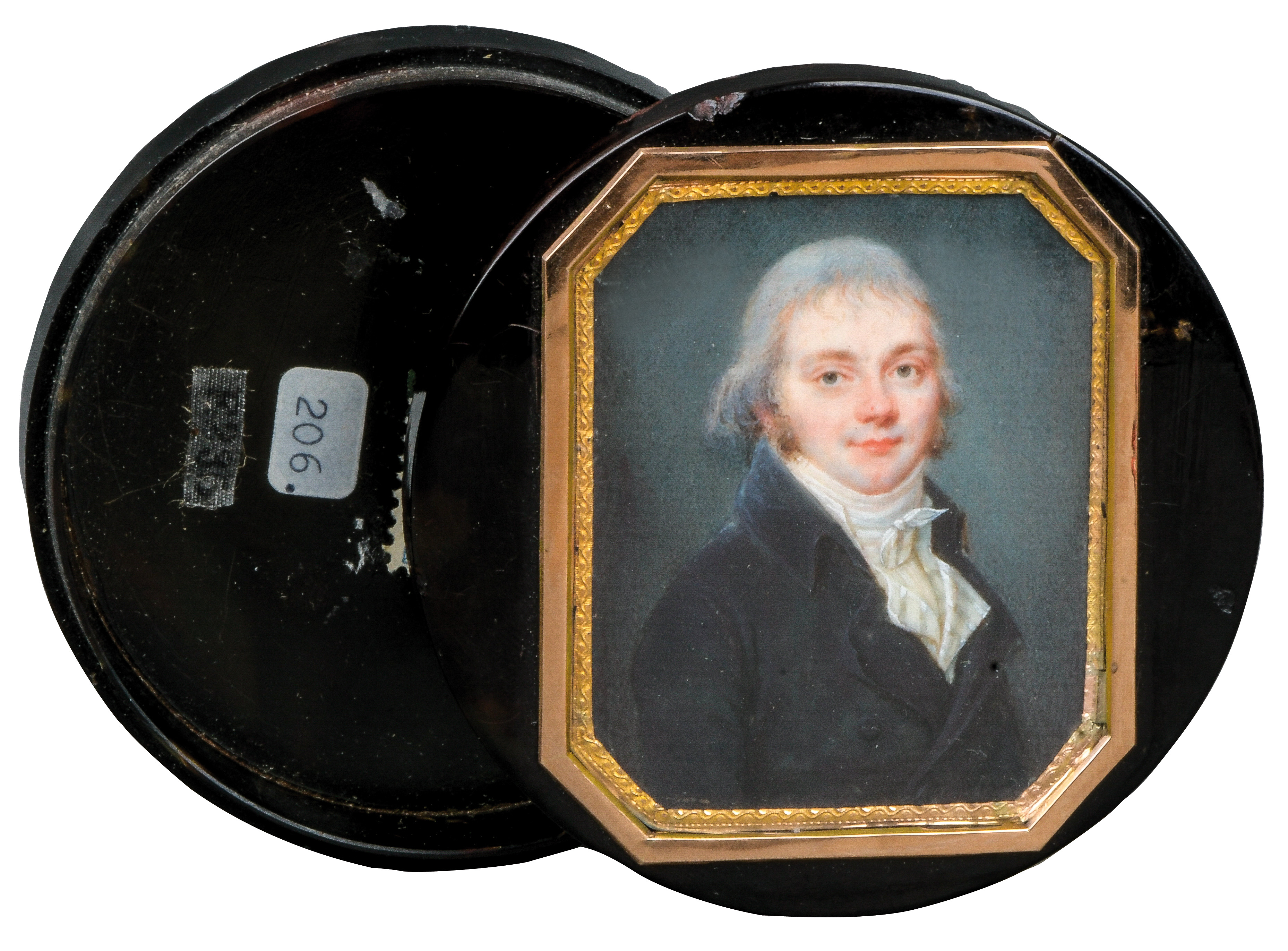 Porträt eines Herren. Bunt gemalt in Puderfarben und aquarelliert auf Elfenbeinplatte, re./u./sign., in oktogonalem Goldrahmen, hi./Gl. gerahmt in runder Schildpattdose eingelassen. Provenienz: Sotheby's, London 1. Mai 1980. Elfenbein-Gutachten und EU-Verkaufsgenehmigung liegen vor und können für EUR 150,00 erworben werden.