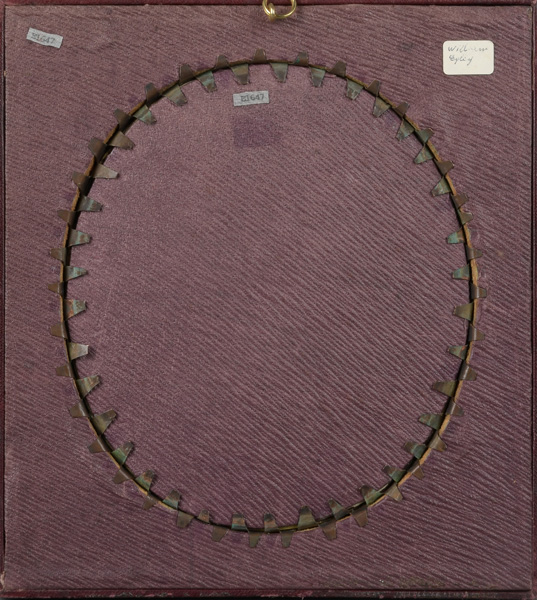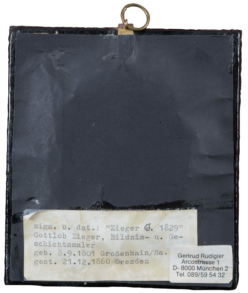 Porträt der Tochter des Künstlers. Bunt gemalt in Puderfarben und aquarelliert auf Elfenbeinplatte, hi./Gl. in breitem Holzrahmen mit Goldleisten. Provenienz: Christie's, London 13. Dez. 1983. Elfenbein-Gutachten und EU-Verkaufsgenehmigung liegen vor und können für EUR 150,00 erworben werden.