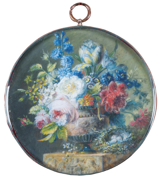 Blumenstillleben in Vase auf Tisch mit Vogelnest. Bunt gemalt in Puderfarben und aquarelliert auf Elfenbeinplatte, verso sign./dat., beidseitig hi./Gl. in 8 kt Goldrahmen. Provenienz: Christie's, London 27. Nov. 2012, GBP 34.000,00. Elfenbein-Gutachten und EU-Verkaufsgenehmigung liegen vor und können für EUR 150,00 erworben werden.