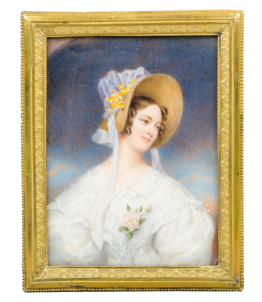 Porträt einer Dame. Bunt gemalt in Puderfarben und aquarelliert auf Elfenbeinplatte, li./mittig/sign./dat. 1813, hi./Gl. in schön profiliertem, ziseliertem, goldfarbenem Rahmen. Provenienz: Christie's, London 7. Okt. 1980. Elfenbein-Gutachten und EU-Verkaufsgenehmigung liegen vor und können für EUR 150,00 erworben werden.