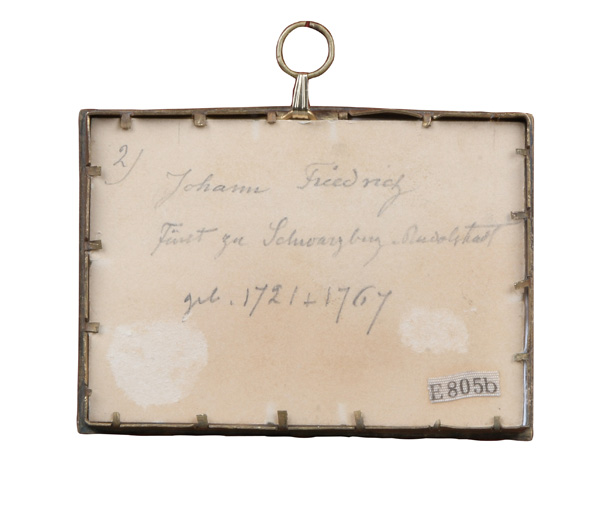 Porträt von Johann Friedrich Fürst von Schwarzburg-Rudolstadt (1721-1767). Bunt gemalt in Puderfarben und aquarelliert auf Elfenbeinplatte, hi./Gl. in schlichtem, poliertem Messingrahmen. Provenienz: Sotheby' s, London 15. Nov. 1982. Elfenbein-Gutachten und EU-Verkaufsgenehmigung liegen vor und können für EUR 150,00 erworben werden.