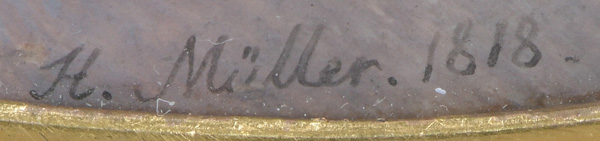 Porträt einer Mutter mit zwei Kindern vor architektonischer Kulisse. Bunt gemalt in Puderfarben und aquarelliert auf Elfenbeinplatte, li./mittig/sign., hi./Gl. in aufwendig ziseliertem, graviertem und feuervergoldetem Bronzerahmen. Provenienz: Slg. Paul Davidsohn, Berlin-Grunewald; Max Perl, Berlin 1924; Christie' s, London 3. Juni 2014, für GBP 17.000,00. Vgl. Leo R. Schidlof, „The Miniature in Europe“, Graz 1964, Bd. I, S. 216. Elfenbein-Gutachten und EU-Verkaufsgenehmigung liegen vor und können für EUR 150,00 erworben werden.