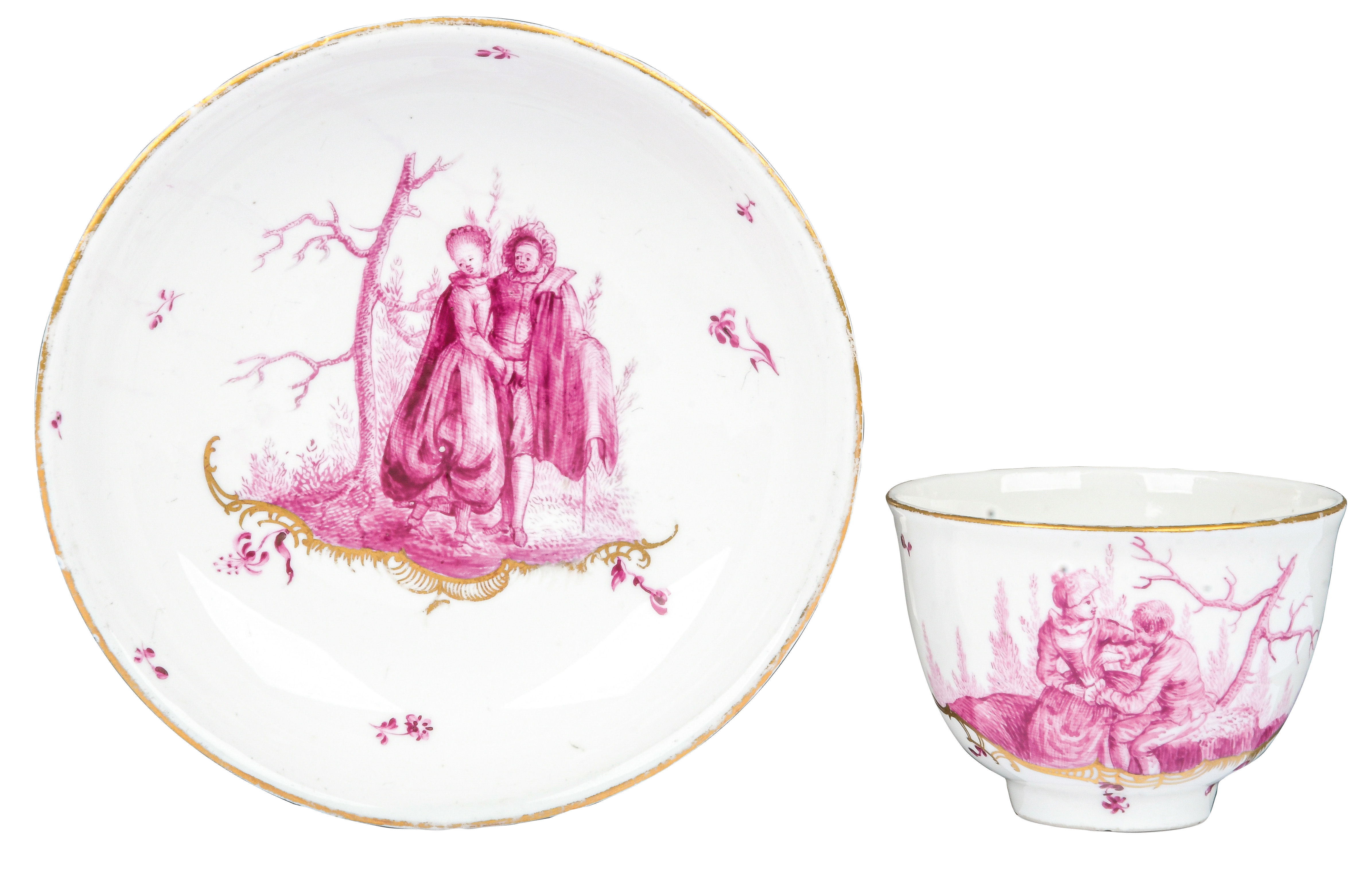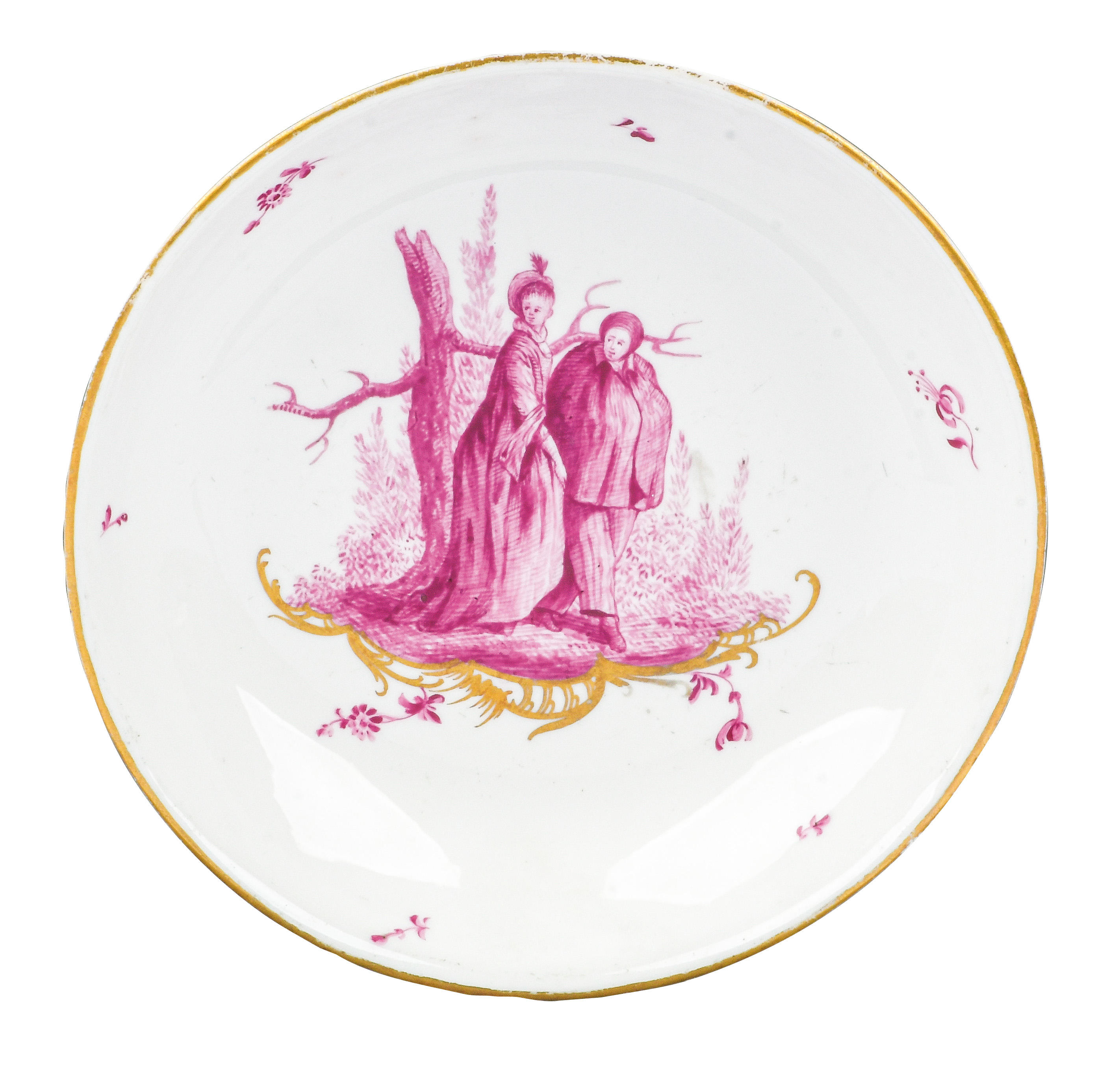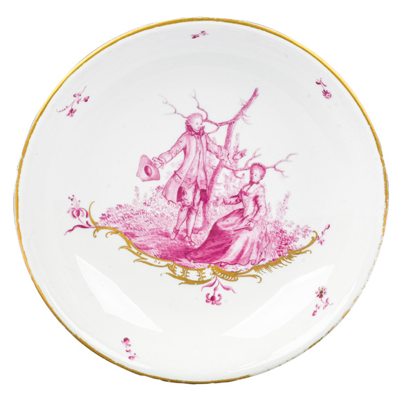 Malermonogramm „R“, Ritzzeichen „B2“, REM Sammlungs-No. 002250. Zugehörig zu einem 19-tlge. Frankenthaler Porzellanservice der Familie Andreas Jordan (1775-1848). Alle Teile exzellent purpurn bemalt mit Figuren, Komödien- und Watteauszenerien in Landschaft auf gold staffierten Rocailleterrassen, teilweise sparsam überdekoriert, Ränder gold gesäumt. Porzellan, am Boden unterglasurblaue, bekrönte, ligierte CT-Marke.Zuerst werden die Serviceteile (Kat.Nr. 371 bis 389) einzeln versteigert. Im Nachgang werden die Einzelbeträge addiert und der höchste Gesamtbetrag erhält den Zuschlag.