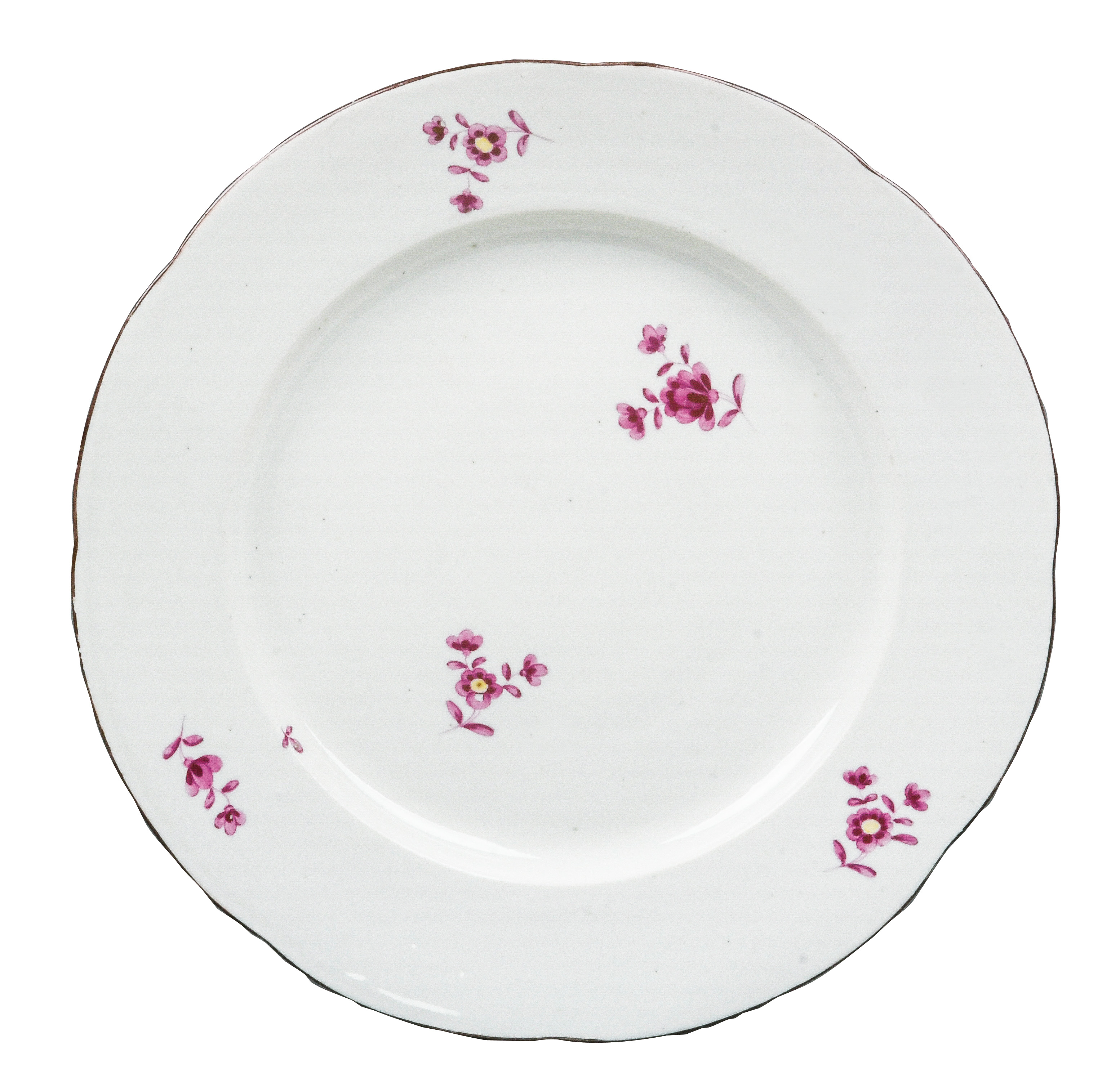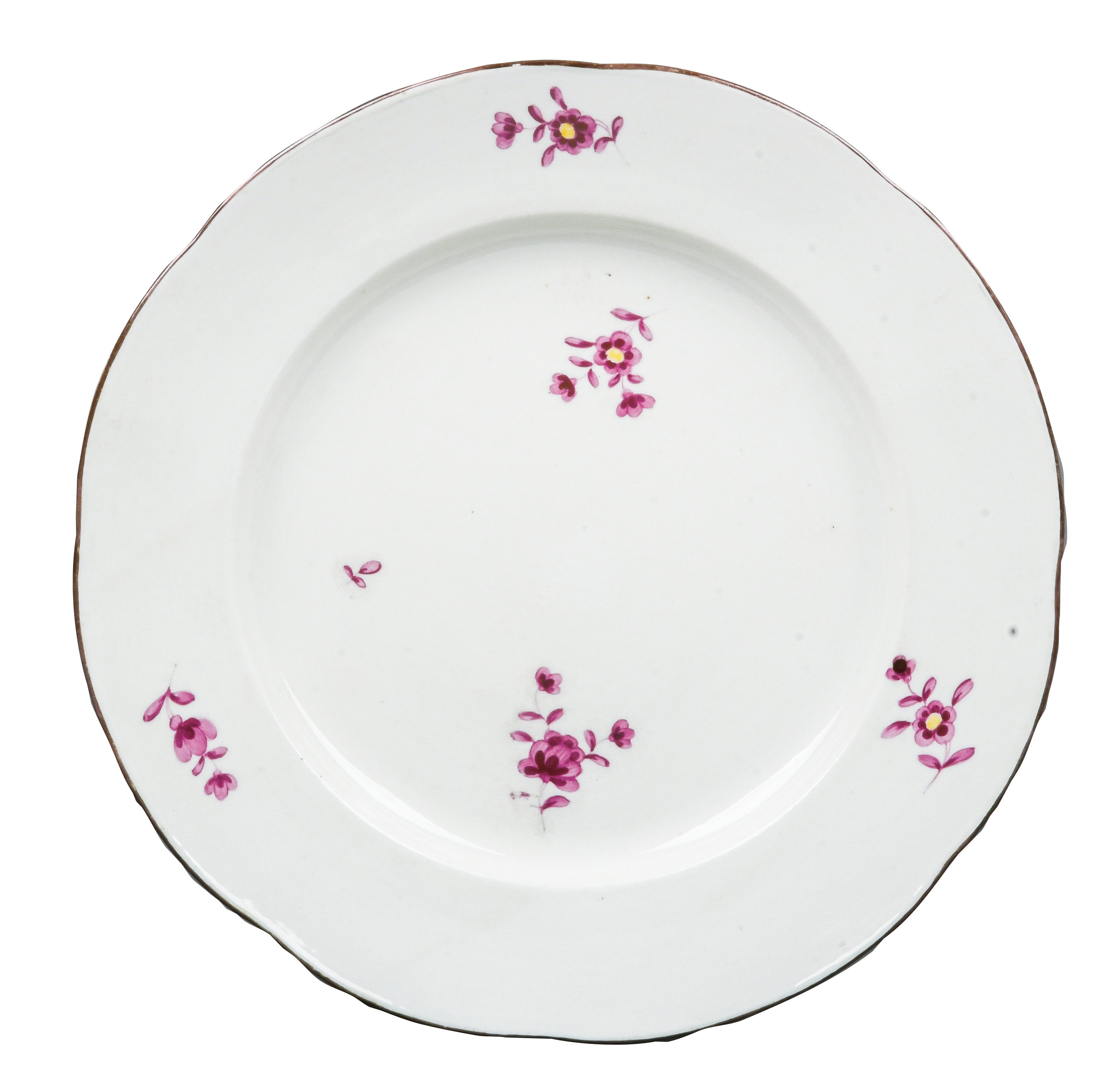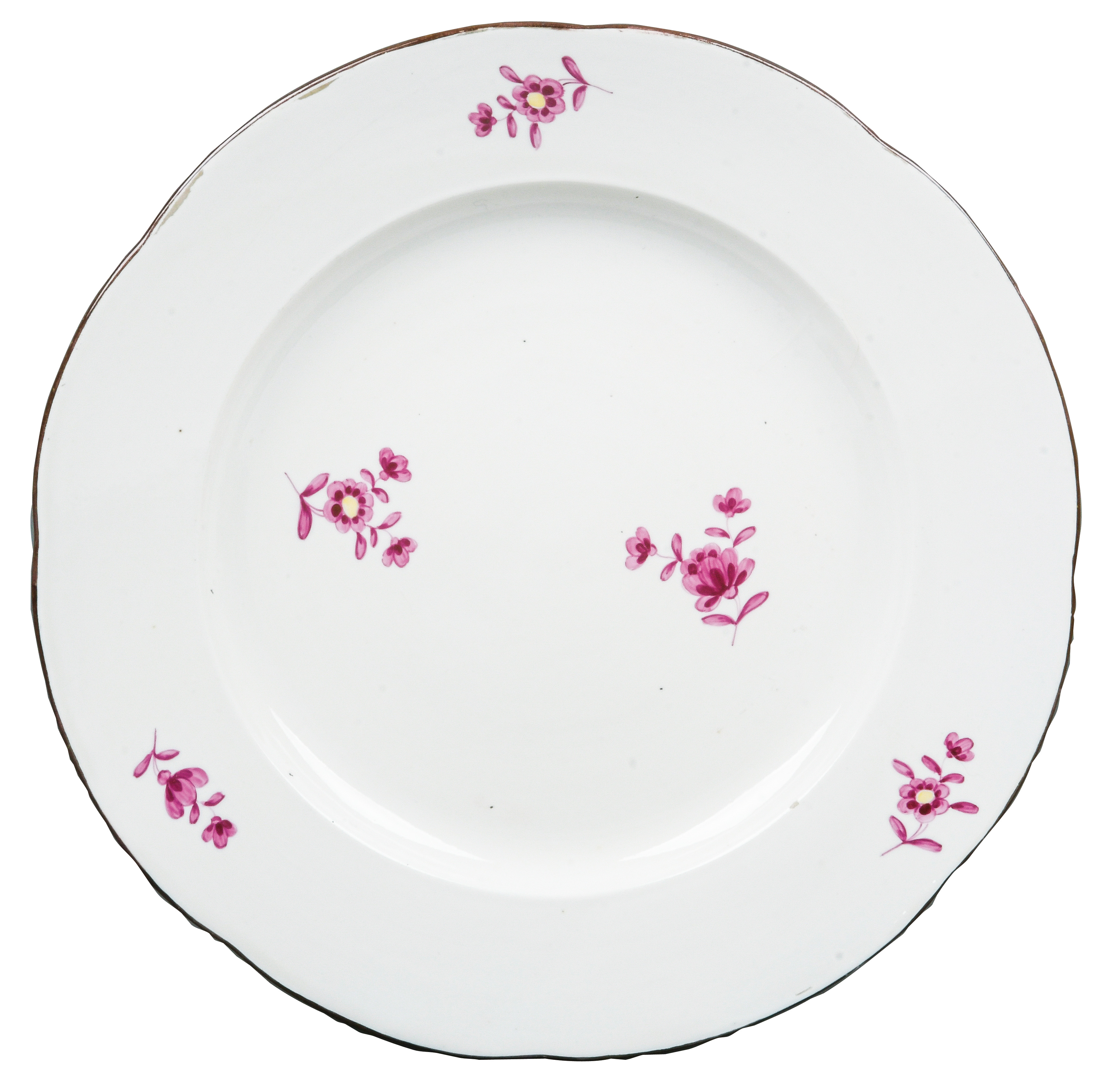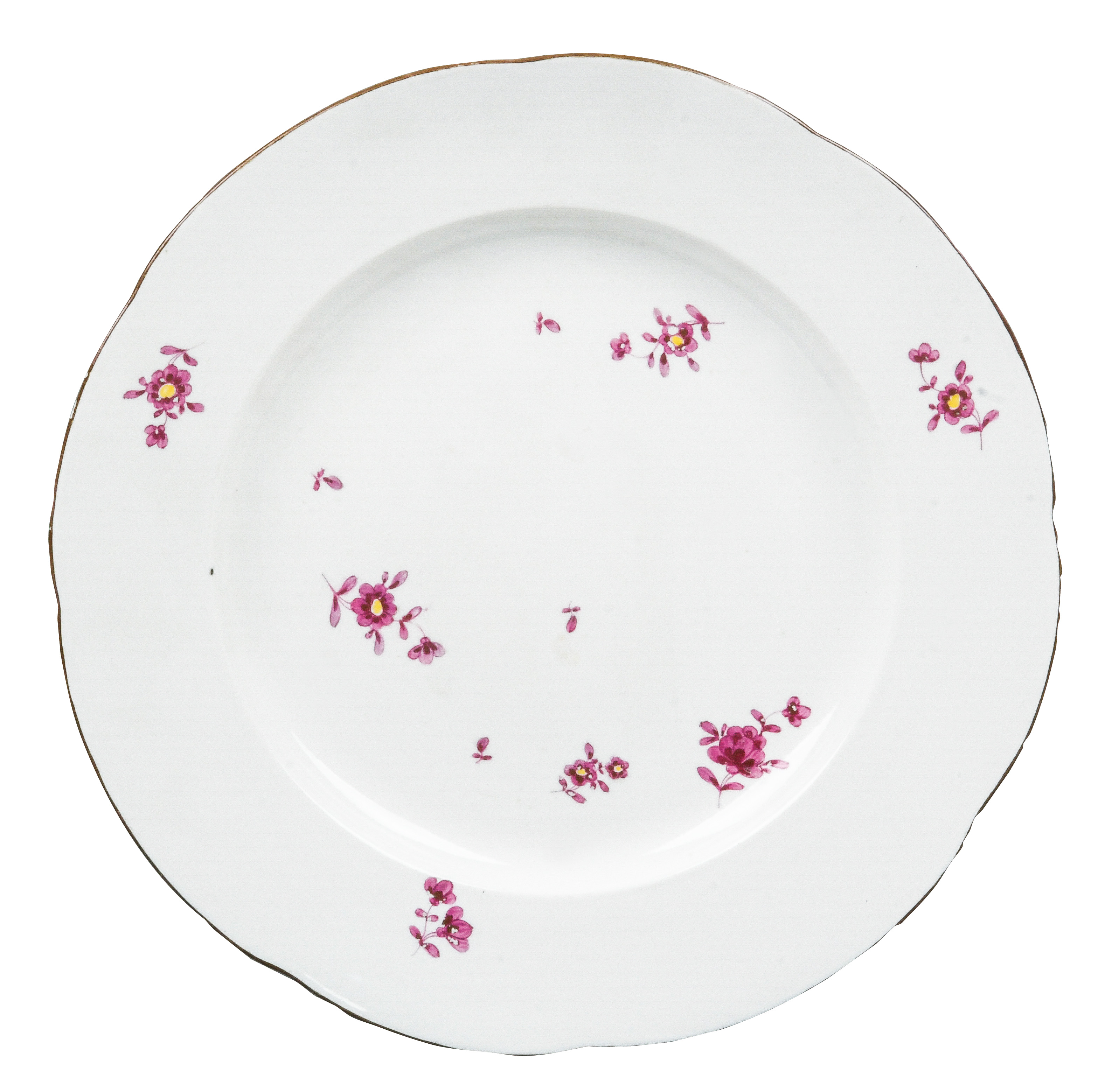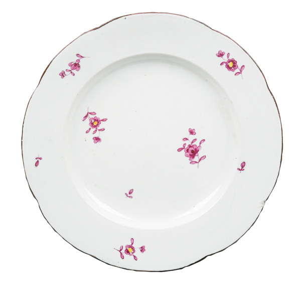 | REM Sammlungs-No. 000047. Zugehörig zu einer Sammlung von neun Tellern. Diese Teller waren bei der Familie Bassermann-Jordan zu Festlichkeiten regelmäßig in Gebrauch. Je rund gemuldet mit steigender Fahne und umlaufend gewelltem, kapuzinerbraun staffiertem Lippenrand. Sparsam purpurn bemalt mit indianischen Streublumen. Porzellan, verso unterglasurblaue, bekrönte, ligierte CT-Marke. Zuerst werden die Teller einzeln aufgerufen. Im Nachgang werden die Einzelbeträge addiert und das höhere Gesamtgebot erhält den Zuschlag.