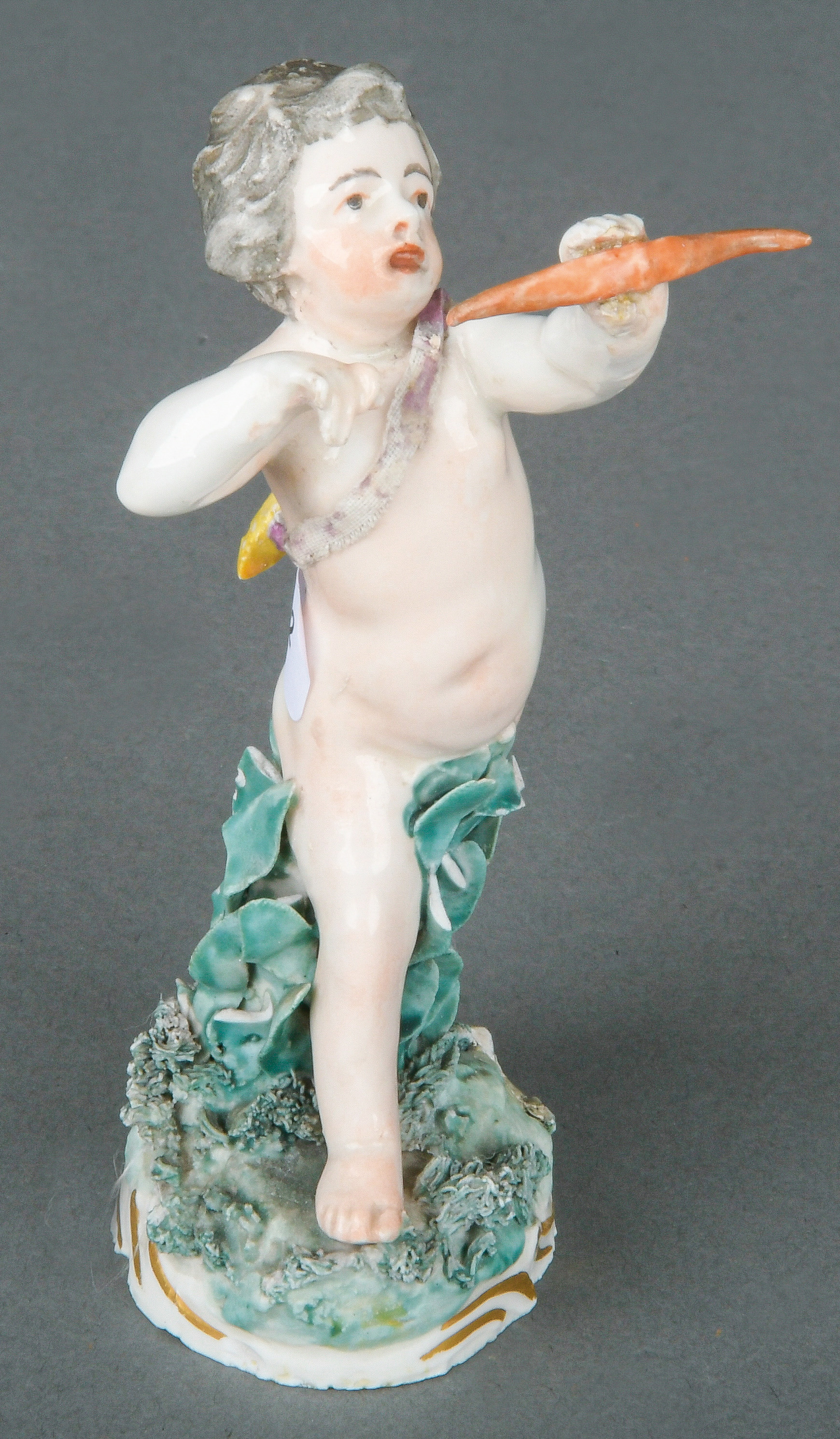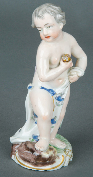 | Auf rundem roccaillemodelliertem Sockel nackt stehend, gold gesäumt. In der Hand einen Bogen haltend und auf dem Rücken einen Köcher. Porzellan, bunt bemalt, am Boden unterglasurblaue, bekrönte, ligierte CT-Marke, REM Sammlungs-No. 002172. Modell von Franz Conrad Linck. Vgl. C. T. Hofmann, Taf. 80, Nr. 348. (min. best., rest.)