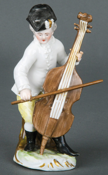 | Stehend musizierend, auf rundem, unregelmäßig roccaillemodelliertem Sockel, gold gesäumt. Porzellan, bunt bemalt, am Boden unterglasurblaue, bekrönte, ligierte CT-Marke, REM Eingangs-Nr. 16754, Sammlungs-No. 002179. Modell von Adam Bauer. Vgl. B. Beaucamp-Markowsky, S. 543, Nr. 295, id. abgebildet.