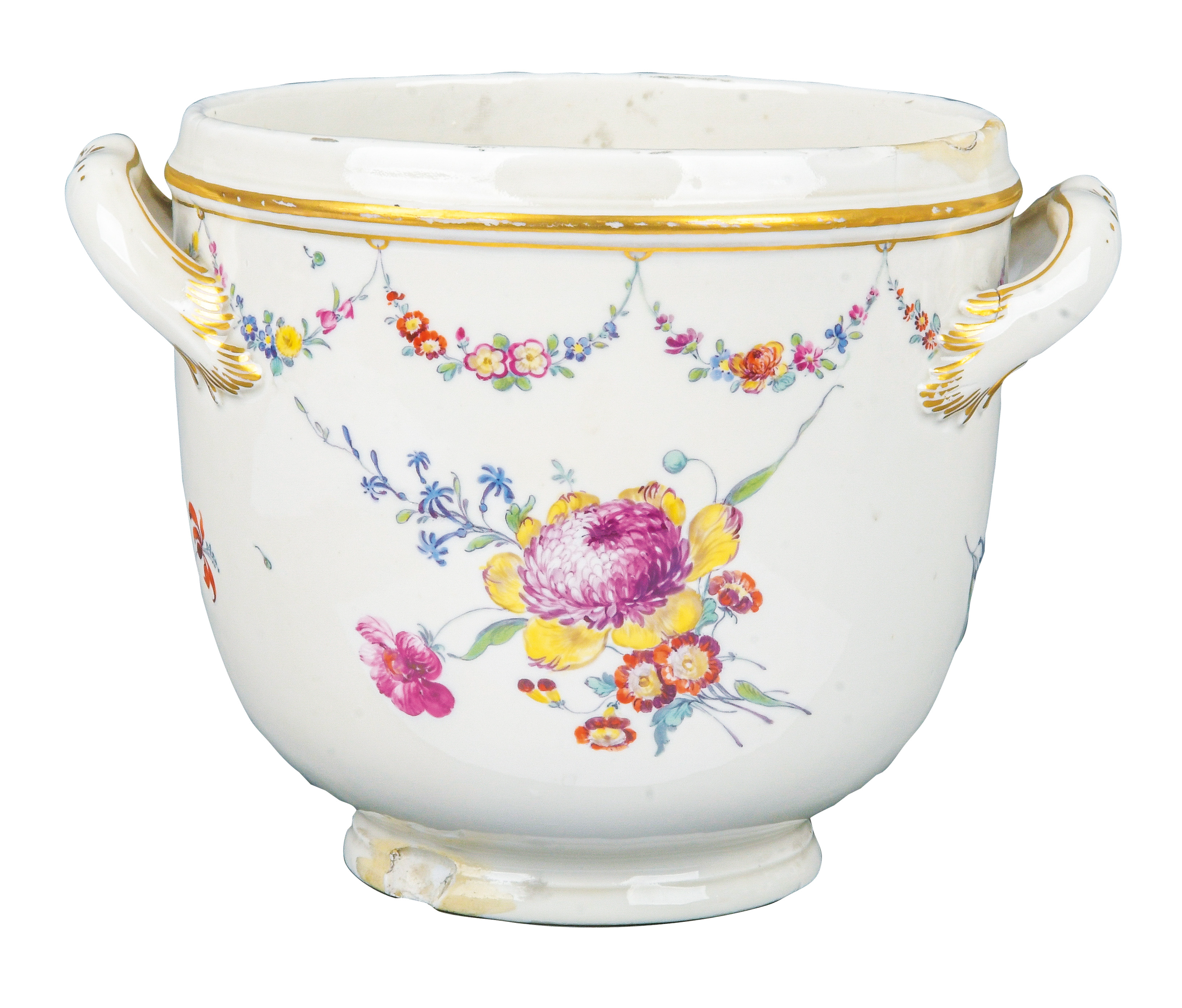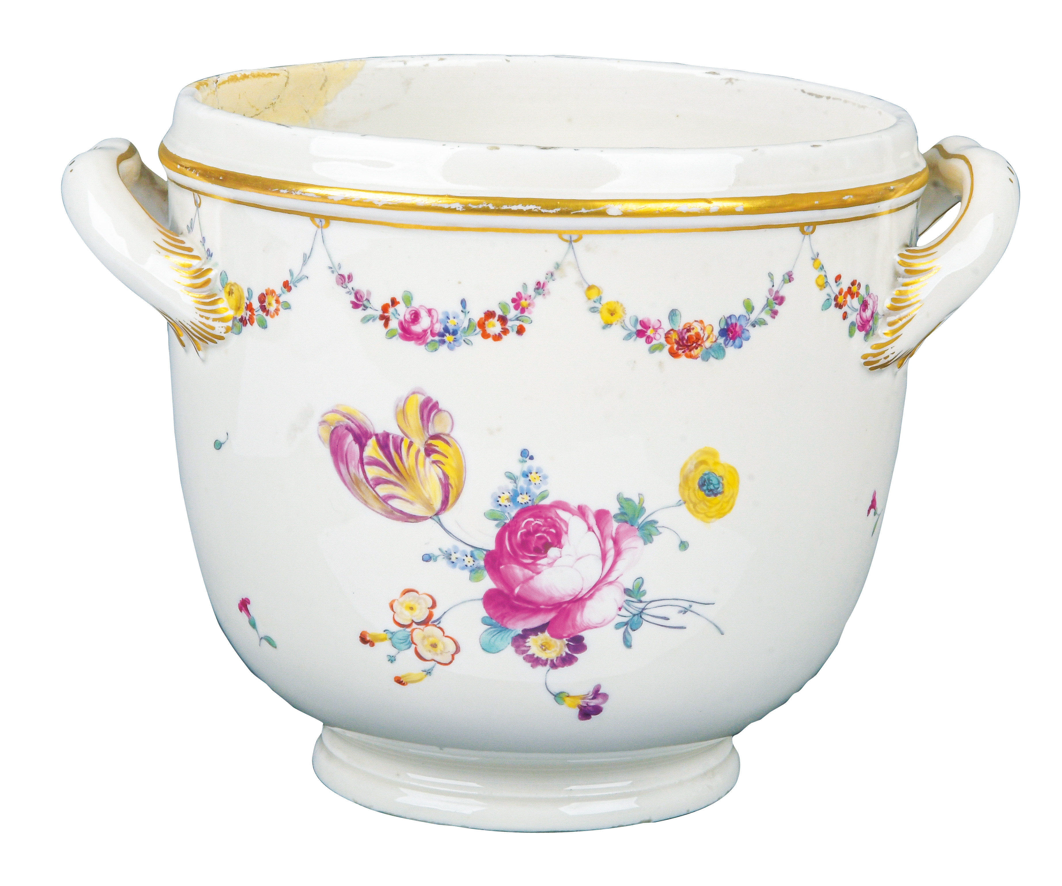 Walzenförmig, auf rundem eingeschnürtem Standring. Seitlich gebogte Henkel, gold gesäumt. Wandung bunt bemalt mit Blumenbouquets, umgeben von Streublumen, oberhalb bunt bemalt mit Blumengirlanden und Goldrand. Porzellan, am Boden unterglasurblaue, bekrönte, ligierte CT-Marke mit Ziffer „7“. REM Sammlungs-No. 000027. (Ränder best. und rest.)