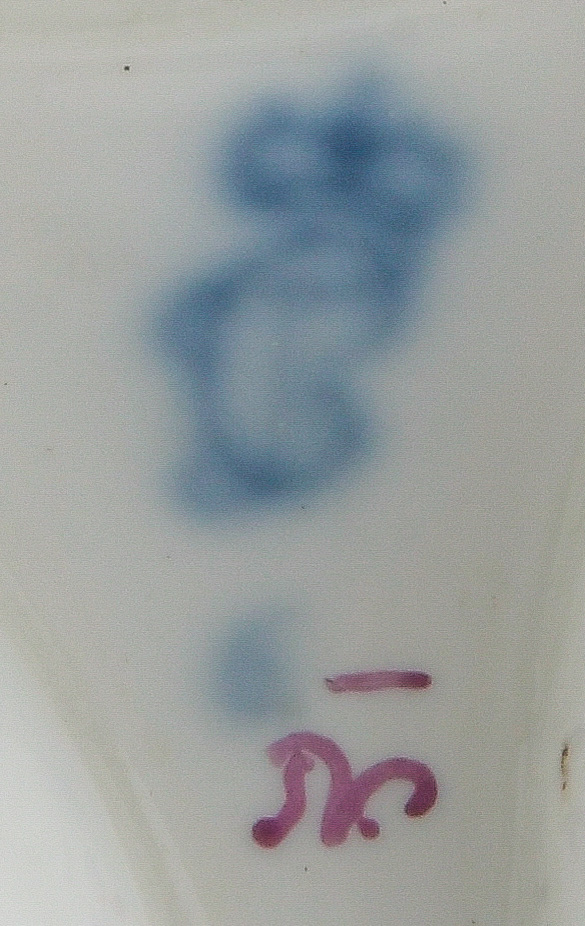 | Gegenstück, passend zur Vornummer. Porzellan, am Boden unterglasurblaue steigende Löwenmarke mit ligiertem „JAH“. Vgl. B. Beaucamp-Markowsky, S. 243, Nr. 132