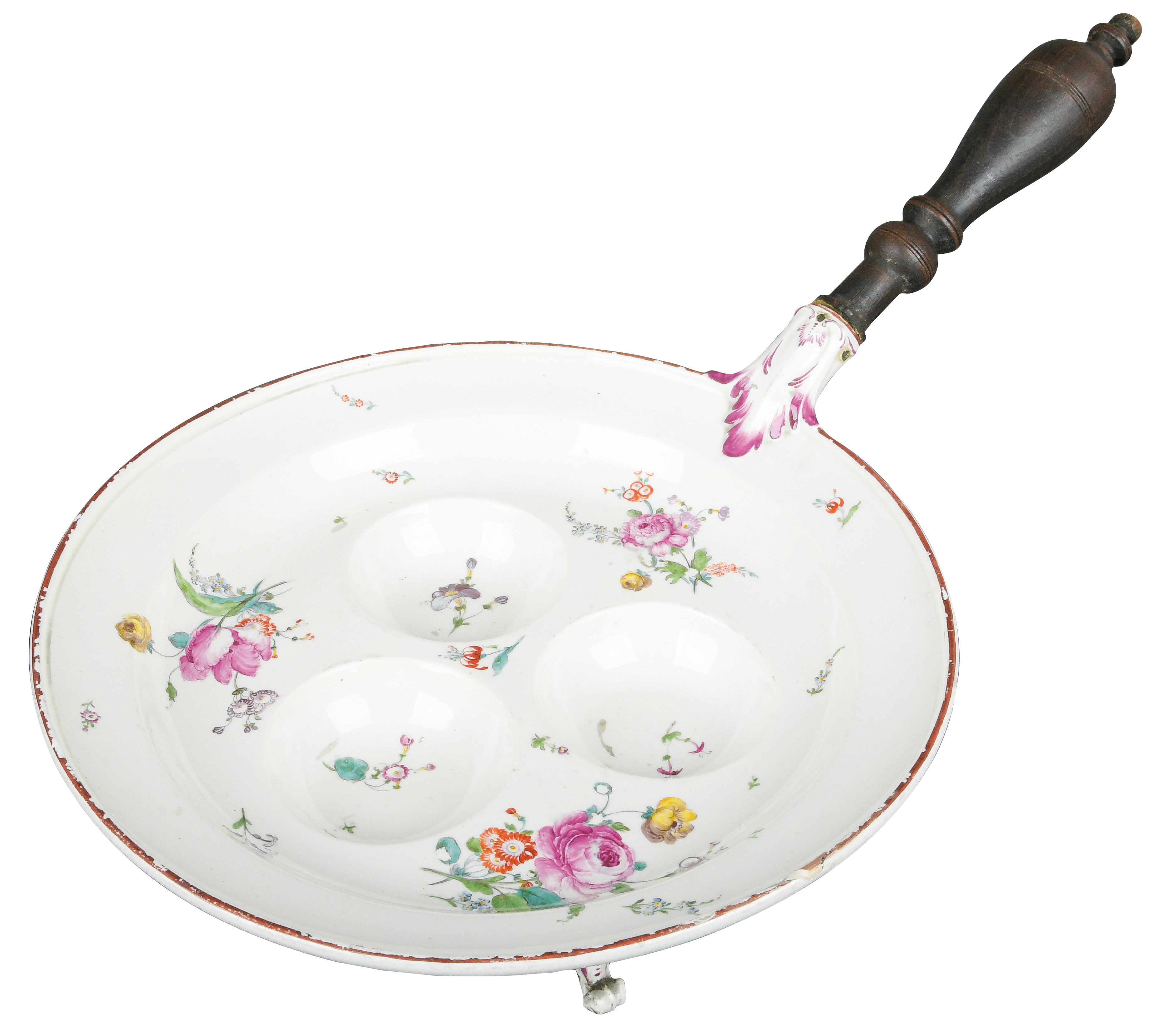 Rund gemuldet mit drei Vertiefungen für aufgeschlagene Eier, auf drei erhöhten Füßen. Seitlicher roccaillereliefierter Stutzen mit eingestecktem gedrechseltem Holzgriff. Schauseite bunt floral bemalt, mit kapuzinerbraunem Rand. Porzellan, verso unterglasurblaue, bekrönte, ligierte CT-Marke, Malermonogramm „N“, wohl für Johann Franz Nierwein, REM Eingangsnr. 91099, Sammlungs-No. 00102. Provenienz: Ersteigert bei Dr. Nagel, Mannheim 1930. Vgl. B. Beaucamp-Markowsky, S. 337ff, Nr. 214ff, id. abgebildet.