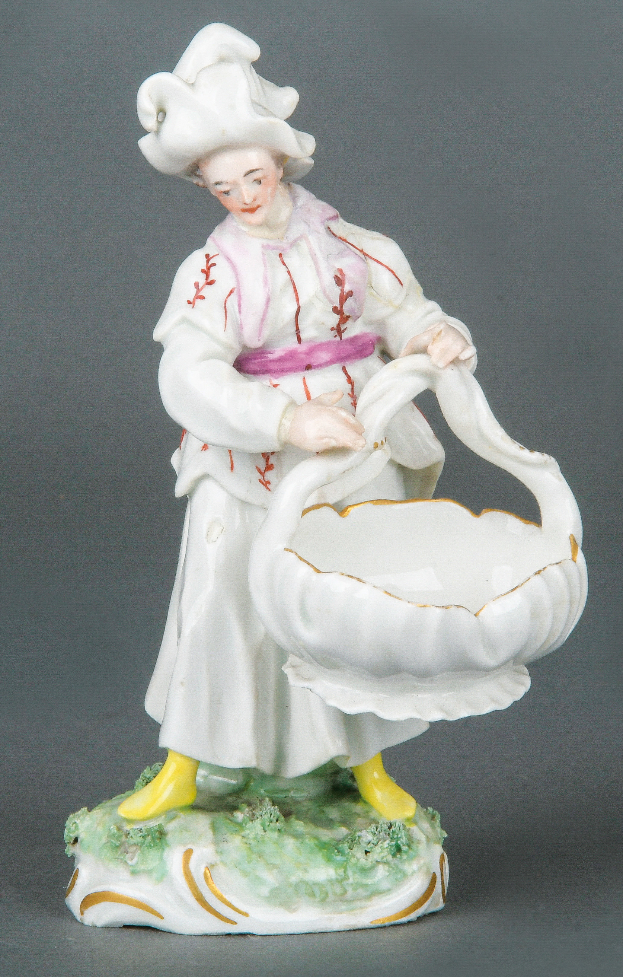 Auf ovalem, gold gesäumtem Rocaillesockel stehend. In den Händen einen großen Korb haltend. Porzellan, bunt bemalt, am Boden unterglasurblaue, bekrönte, ligierte CT-Marke, REM Sammlungs-No. 002201. Modell von Carl Gottlieb Lück. Vgl. C. T. Hofmann, Taf. 117, Nr. 483.