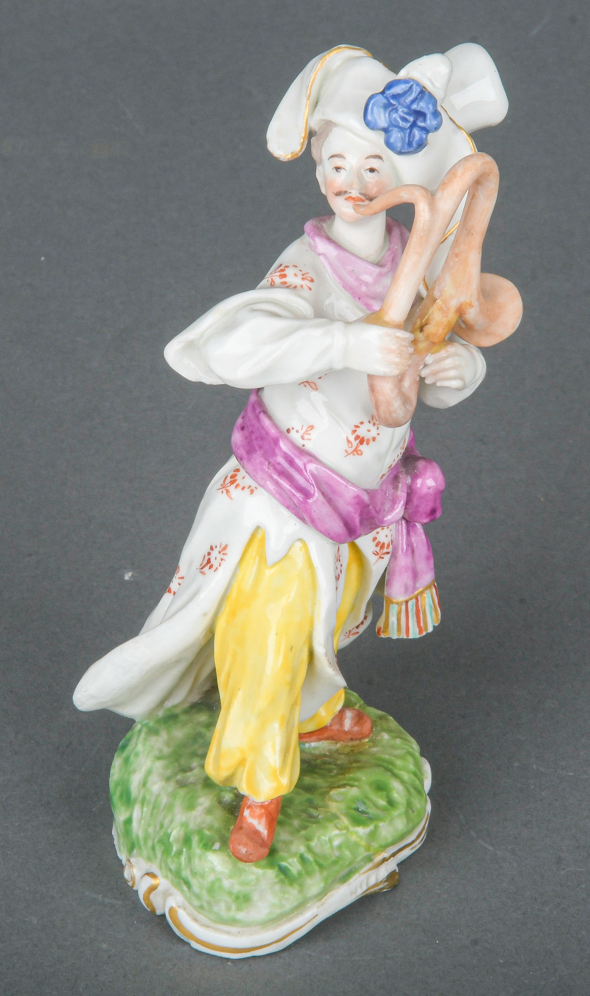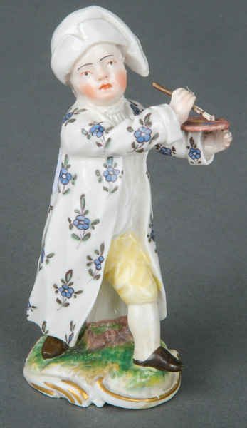 Auf unregelmäßigem, gold gesäumtem Rocaillesockel stehend. In den Händen das Instrument haltend. Porzellan, bunt bemalt, am Boden unterglasurblaue, bekrönte, ligierte CT-Marke, REM Sammlungs-No. 002219. Modell von Carl Gottlieb Lück. Vgl. B. Beaucamp-Markowsky, S. 526ff, Nr. 279ff.