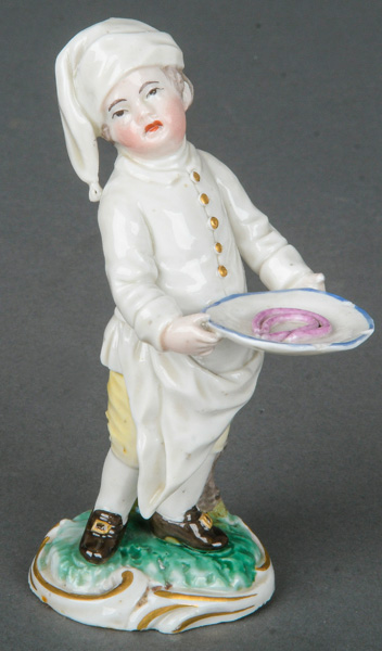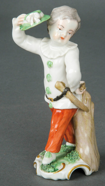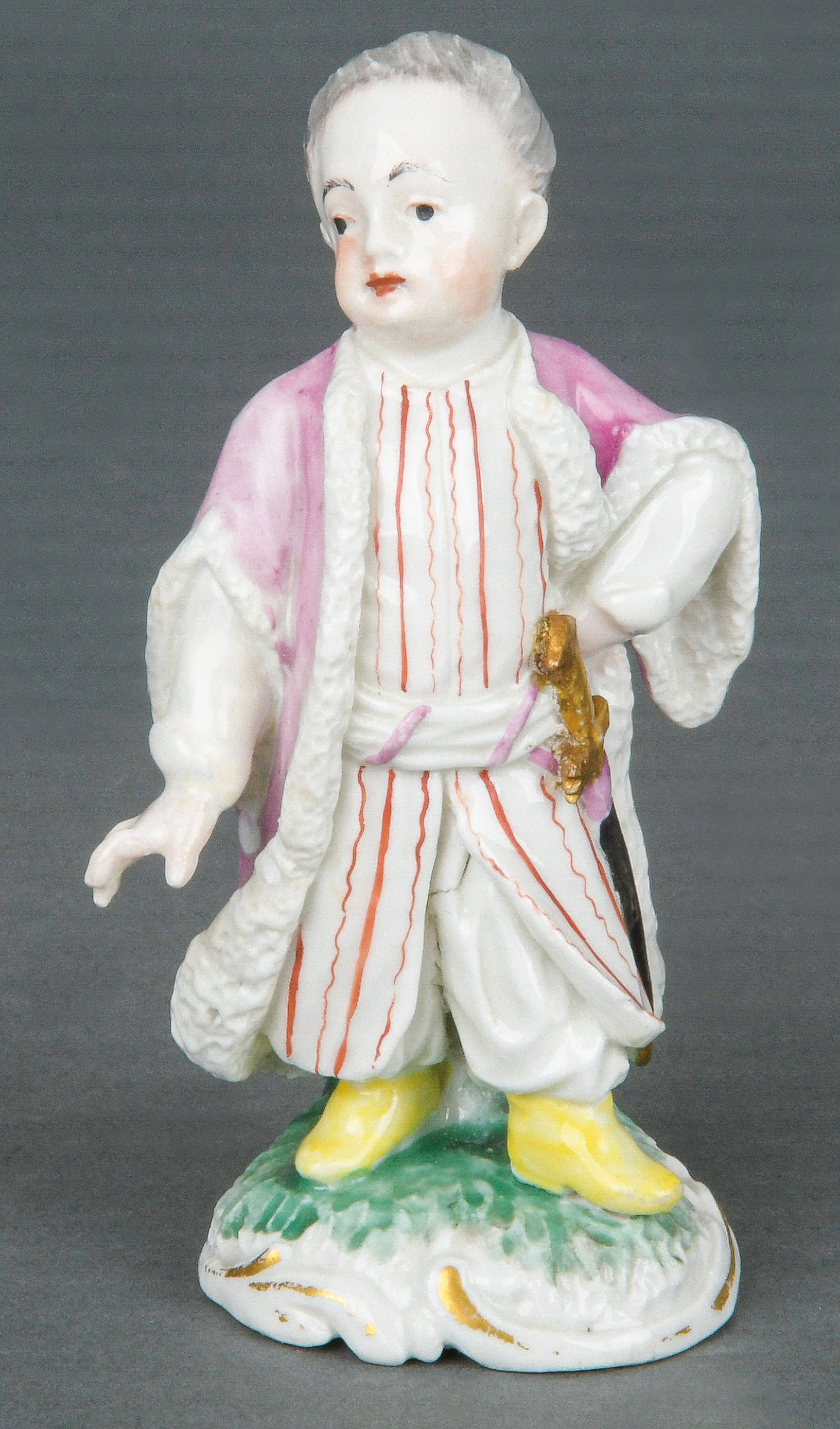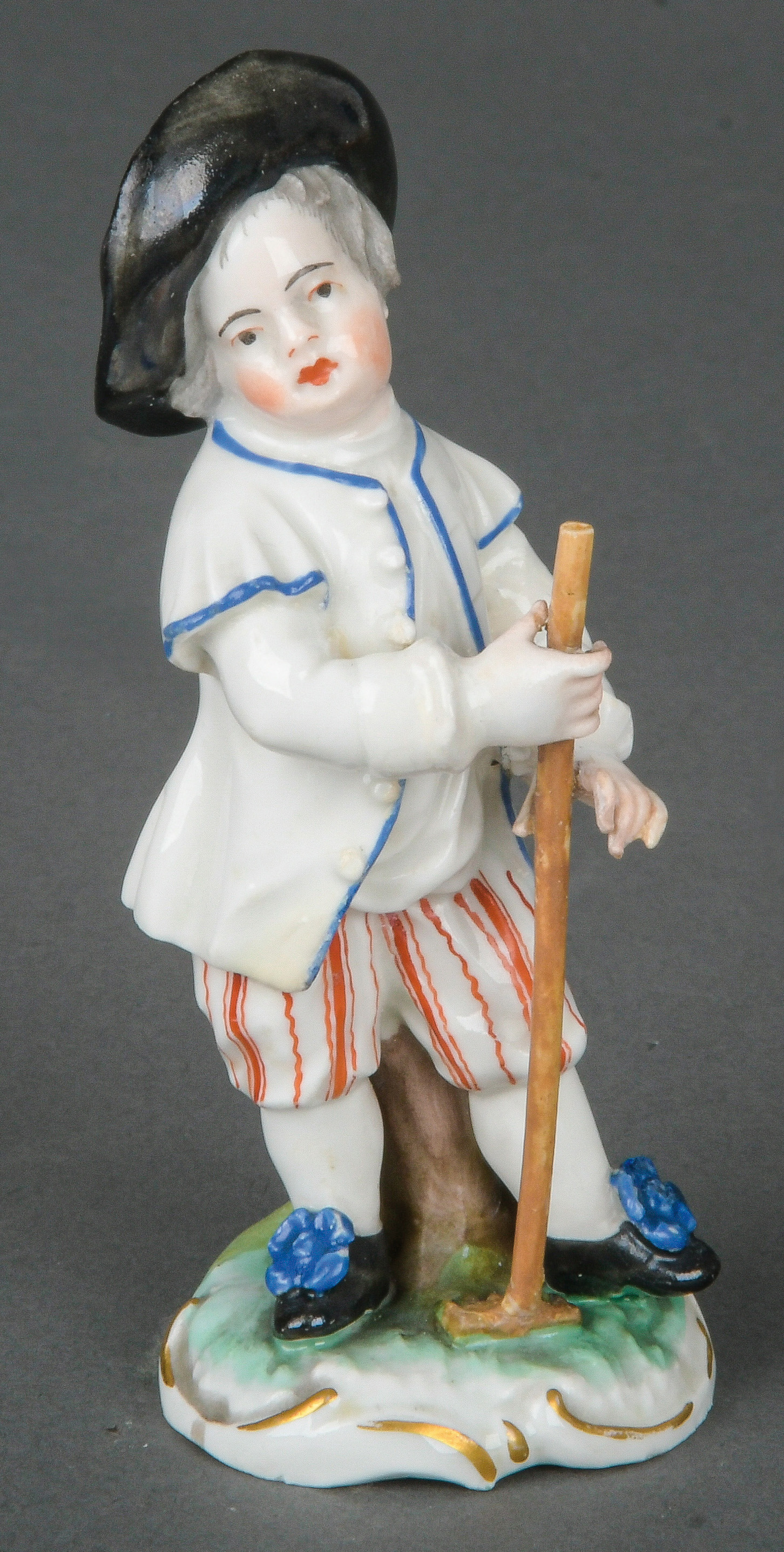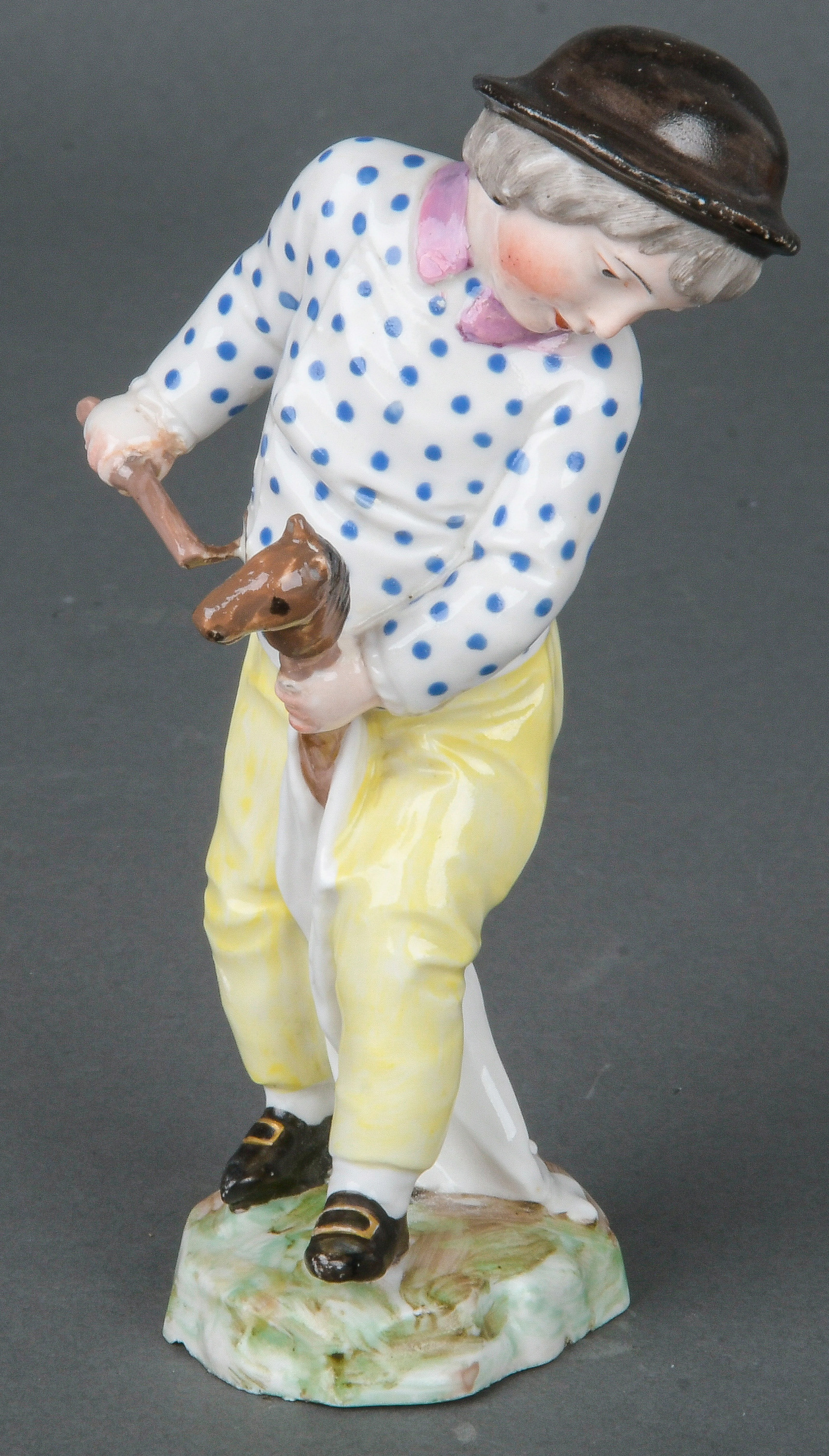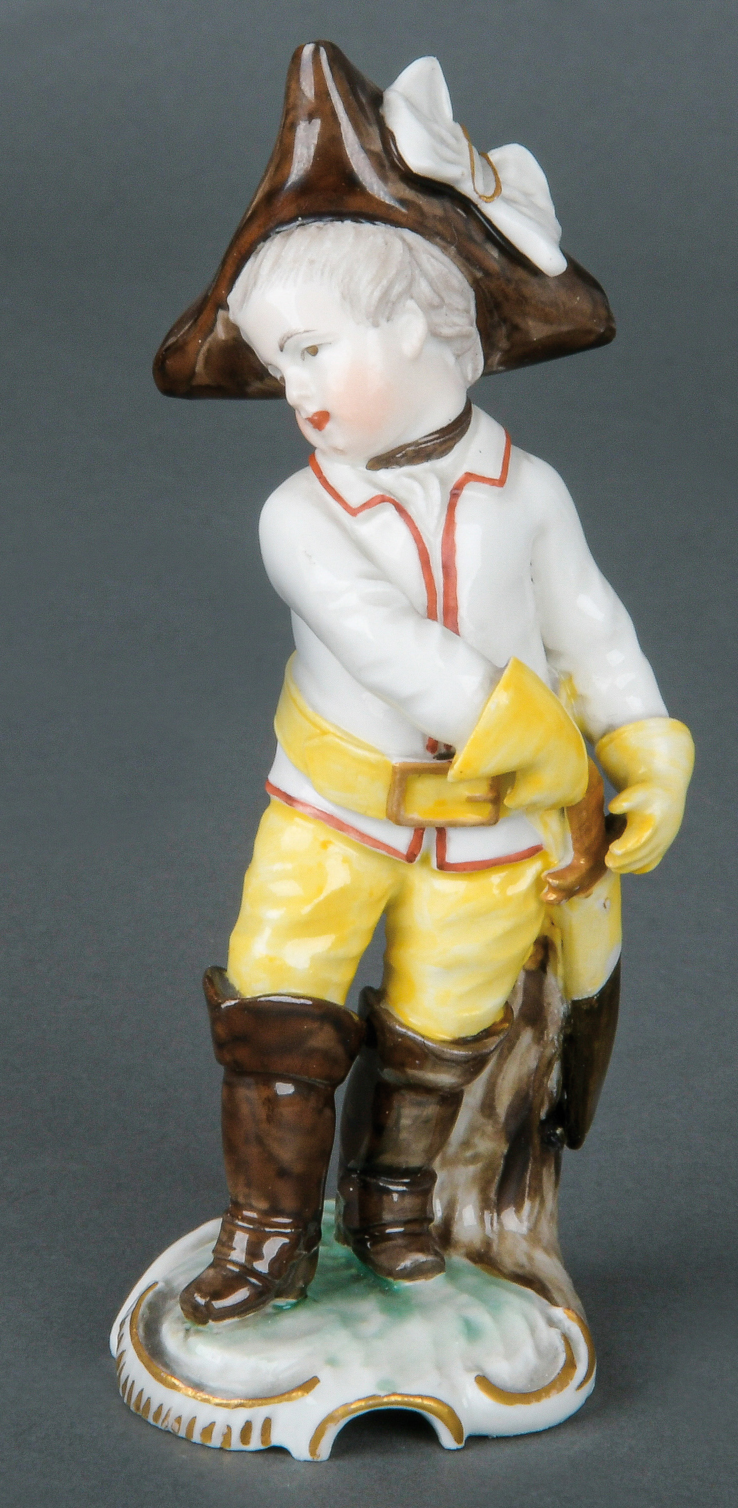 Aus einer Folge verkleideter Kinder. Auf rundem Roccaillesockel stehend, gold gesäumt. Seinen Hut haltend und eine Peitsche mit sich führend. Porzellan, bunt bemalt, am Boden unterglasurblaue, bekrönte, ligierte CT-Marke, REM Eingangsnr. 16752, Sammlungs-No. 002142. Modell von Franz Conrad Linck. Vgl. B. Beaucamp-Markowsky, S. 371ff, Nr. 206,