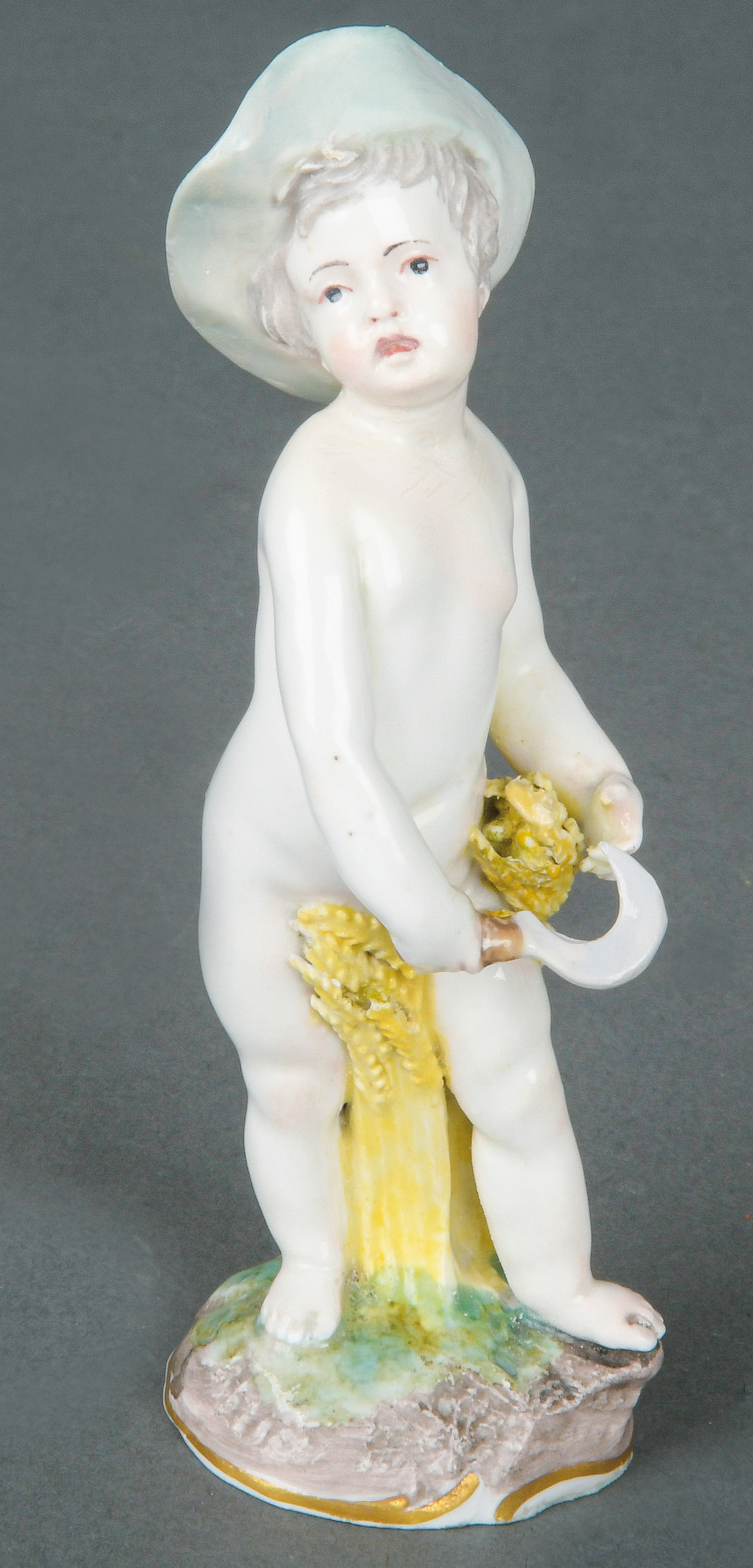 Aus einer Folge von Allegorien der vier Jahreszeiten. Nackt stehend, mit Ähren und Sichel, auf rundem Roccaillesockel, gold gesäumt. Porzellan, bunt bemalt, am Boden unterglasurblaue, bekrönte, ligierte CT-Marke mit „AB“, REM Sammlungs-No. 02215. Modell von Franz Conrad Linck. Vgl. B. Beaucamp-Markowsky, S. 422ff, Nr. 232.