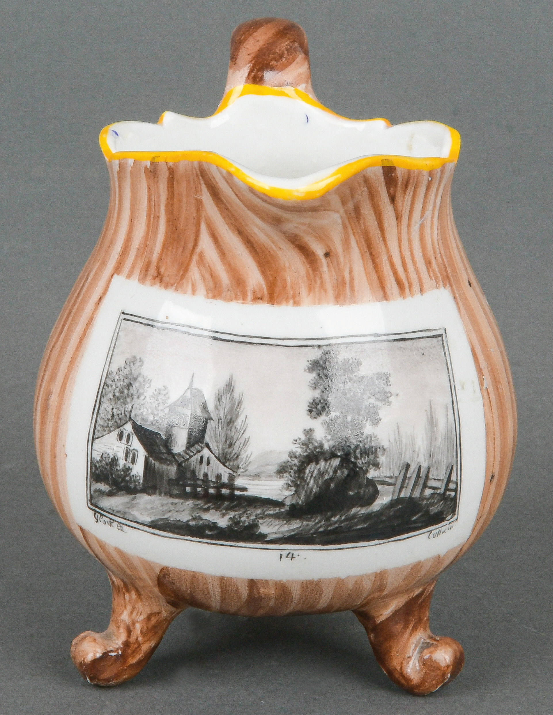 Birnförmig, mit Ohrhenkel, auf drei Volutenfüßen. Fond mit Holzmaserdekor und gelbem Rand. Schauseite mit rechteckiger Aussparung, diese in Sepiacamaieu bemalt mit Architekturlandschaft, li./u./sign. (Michael) Glöckel. Porzellan, am Boden unterglasurblaue, bekrönte, ligierte CT-Marke, REM Sammlungs-No. 002142. Vgl. C .L. Fuchs (Hrsg.), „Solitaire und Déjeuners der Frankenthaler Manufaktur (1755-1800)“, Ausstellungskatalog Kurpfälzisches Museum, Heidelberg 1993-1994, S. 116, Nr. 94.