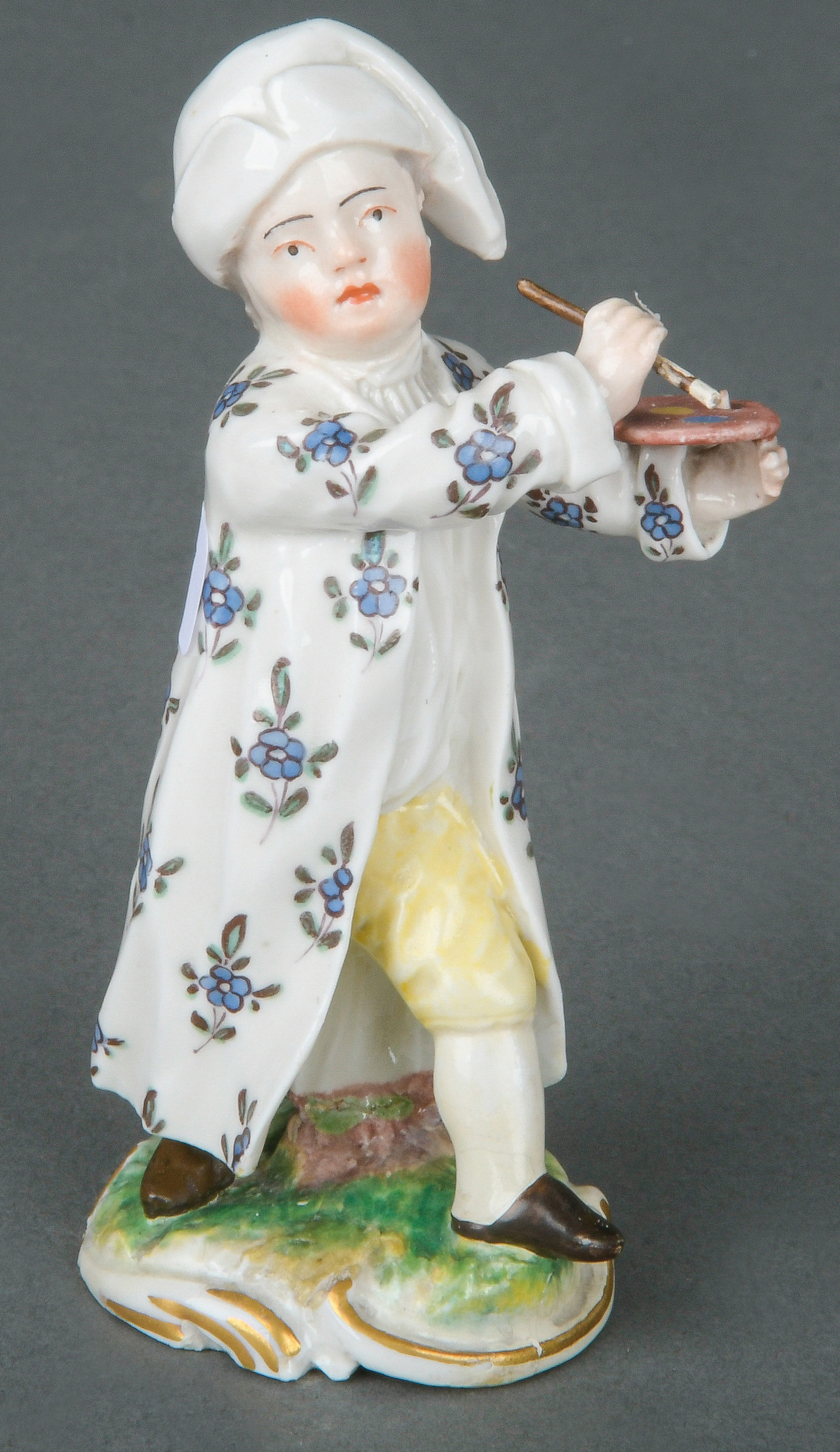 Auf rundem, roccaillemodelliertem, gold gesäumtem Sockel stehend. In den Händen Palette und Pinsel haltend. Porzellan, bunt bemalt, am Boden unterglasurblaue, bekrönte, ligierte CT-Marke, REM Eingangsnr. 16748, Sammlungs-No. 002185. Modell von Franz Conrad Linck. Vgl. B. Beaucamp-Markowsky, S. 367, Nr. 202.