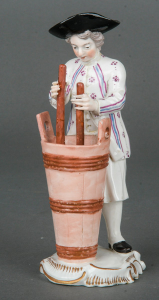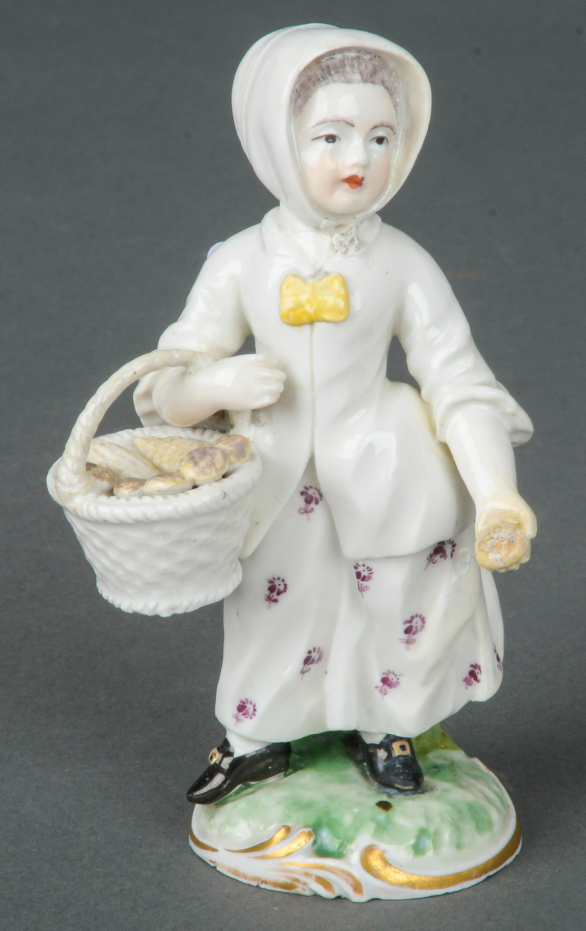Auf rundem, roccaillemodelliertem Sockel stehend, gold gesäumt. In der Hand ein Brötchen bzw. einen gefüllten Brötchenkorb haltend. Porzellan, bunt bemalt, am Boden unterglasurblaue, bekrönte, ligierte CT-Marke, Malerzeichen „De“, REM Eingangsnr. 16751, Sammlungs-No. 002214. Modell von Franz Conrad Linck. Vgl. B. Beaucamp-Markowsky, S. 367, Nr. 201, id. abgebildet.