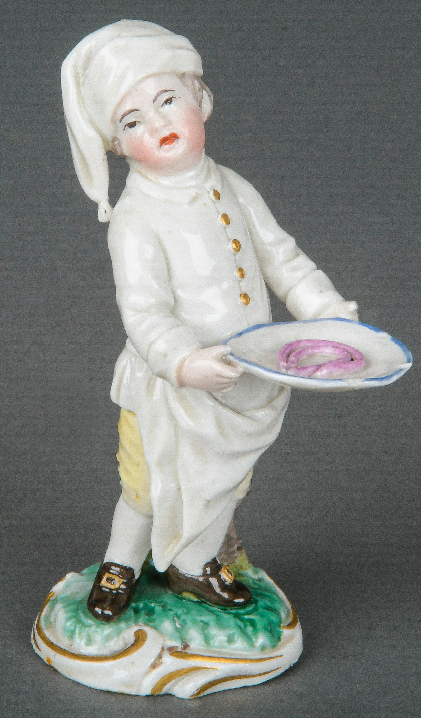 Auf rundem, roccaillemodelliertem, gold gesäumtem Sockel stehend. In den Händen eine runde Platte mit Würstchen haltend. Porzellan, bunt bemalt, am Boden unterglasurblaue, bekrönte, ligierte CT-Marke, REM Eingangsnr. 16747, Sammlungs-No. 001715. Modell von Franz Conrad Linck. Vgl. B. Beaucamp-Markowsky, S. 366, Nr. 200.