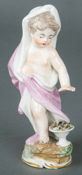 Stehend, auf unregelmäßigem, rocaillemodellierten Sockel, gold gesäumt. Im Vordergrund eine Kiepe, gefüllt mit roten Trauben. Porzellan, bunt bemalt, am Boden unterglasurblaue, bekrönte, ligierte CT-Marke, REM Sammlungs-No. 002198. Modell von Johann Wilhelm Lanz. Vgl. B. Beaucamp-Markowsky, S. 269ff, Nr. 132ff.