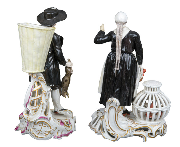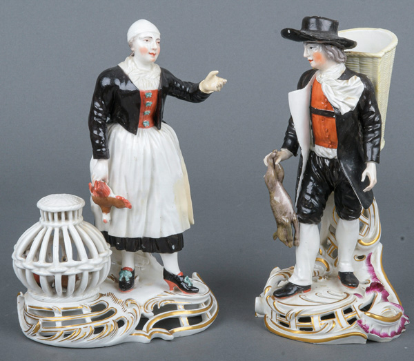 Je stehend, auf ovalem, aufwendig modelliertem, durchbrochenem Rocaillesockel, gold gesäumt. In den Händen einen Hasen bzw. eine Henne haltend, seitlich ein Käfig mit weiterem Federvieh. Porzellan, bunt bemalt, die Bauernfigur am Boden unterglasurblaue, bekrönte, ligierte CT-Marke. Modelle von Johann Friedrich Lück. Vgl. B. Beaucamp-Markowsky, S. 342ff, Nr. 181. (min. rest.)