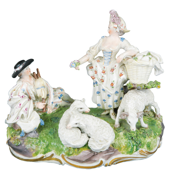 Liegender Schäfer mit Dudelsack und stehende Dame, auf ovalem Roccaillesockel, gold gesäumt. Mittig zwei liegende und seitlich ein stehendes Schaf. Porzellan, am Boden unterglasurblaue, bekrönte, ligierte CT-Marke. Modell von Karl Gottlieb Lück. Vgl. C. T. Hofmann, Taf. 106, Nr. 435. (rest.)