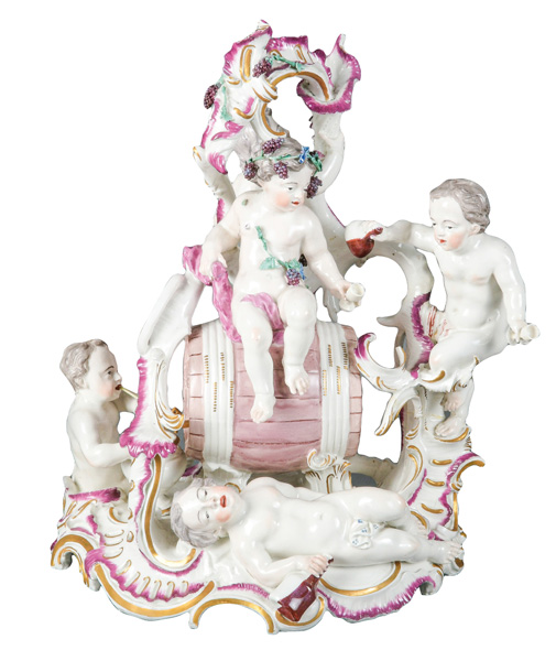 Runder, aufwendig modellierter Roccaillesockel, purpurn und gold gesäumt. Darauf mittig ein Rotweinfass mit sitzendem Putto als Bacchus und vier weiteren Putten mit Gläsern oder Flasche in der Hand, die um ihn herum sitzen bzw. liegen. Porzellan, am Boden unterglasurblaue, bekrönte, ligierte CT-Marke mit „AB“, REM Eingangsnr. 16740, Sammlungs-No. 00014. Modell von Johann Wilhelm Lanz. Vgl. B. Beaucamp-Markowsky, S. 167, Nr. 59.