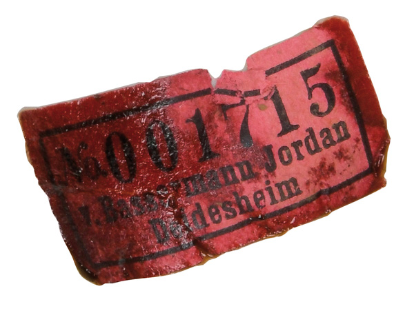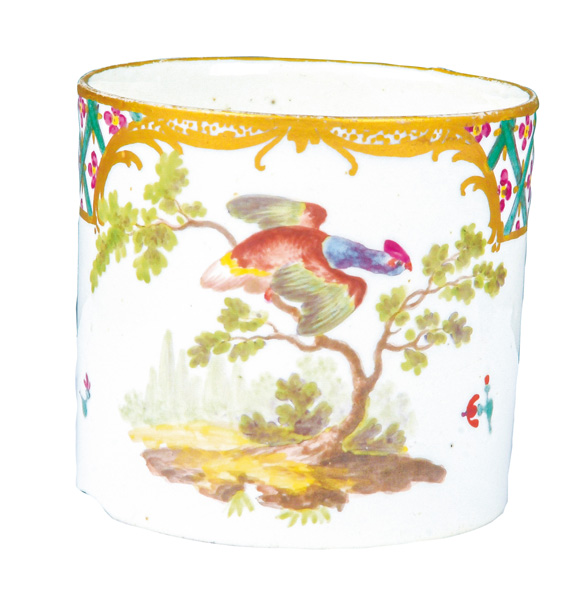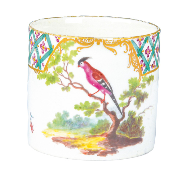 Walzenförmig. Schauseite bunt bemalt mit exotischem Vogel auf Ast sitzend, umgeben von Streublumen. Oberhalb gold staffierte Rocaillekartusche, übergehend in breite Bordüre aus grünem Gitterwerk und purpurnen Blüten. Porzellan, am Boden unterglasurblaue, bekrönte, ligierte CT-Marke. Vgl. B. Beaucamp-Markowsky, S. 98. Nr. 332. (best.)