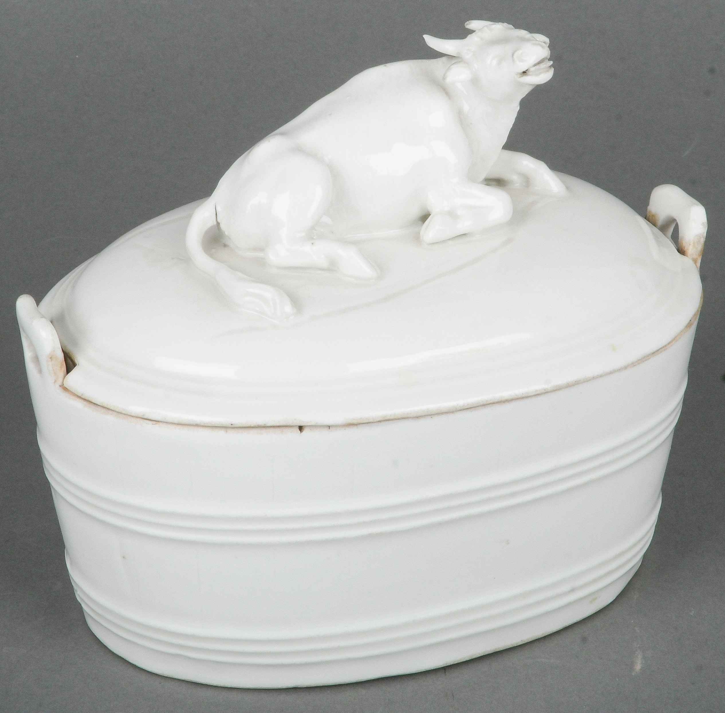 In Bottichform, mit seitlich überstehenden, durchstochenen Henkeln. Gewölbter, profilierter Deckel mit naturalistisch modellierter ruhenden Kuh. Porzellan, weiß glasiert, am Boden unterglasurblaue Löwenmarke, REM Eingangsnr. 91097, Sammlungs-No. 000015. Es ist anzunehmen, dass Prinzessin Marianne von Pfalz-Zweibücken (1754-1828), Nichte von Kurfürstin Elisabeth Auguste, Empfängerin dieser Dose war. Vgl. B. Beaucamp-Markowsky, S. 334ff, Nr. 212ff.