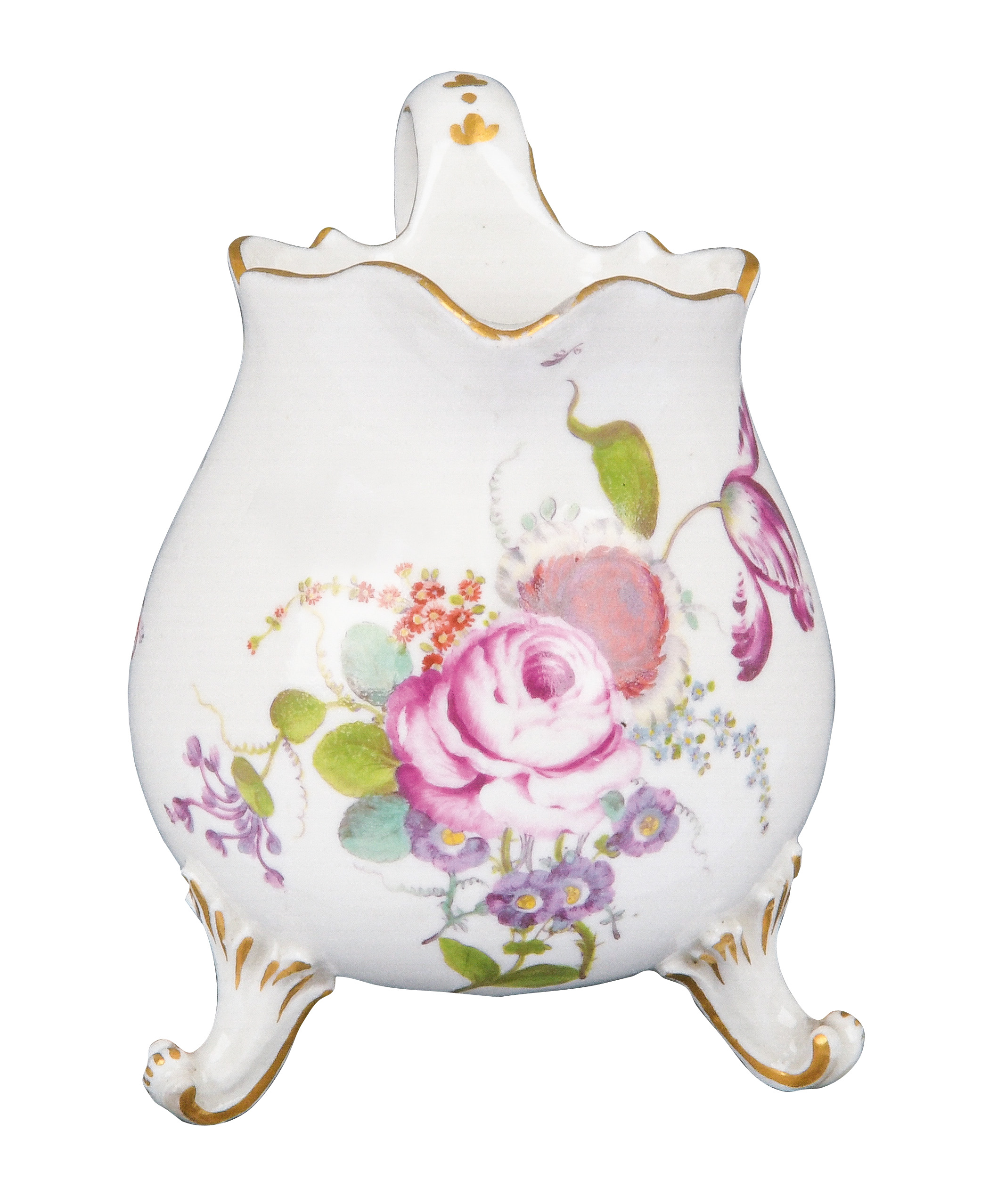Birnförmig, auf drei Volutenfüßen. Seitlich ein leicht geschweifter Henkel. Schauseite bunt bemalt mit Blumenbouquet, umgeben von Streublumen, Ränder gold gesäumt. Porzellan, am Boden unterglasurblaue, bekrönte, ligierte CT-Marke, REM Sammlungs-No. 000075.