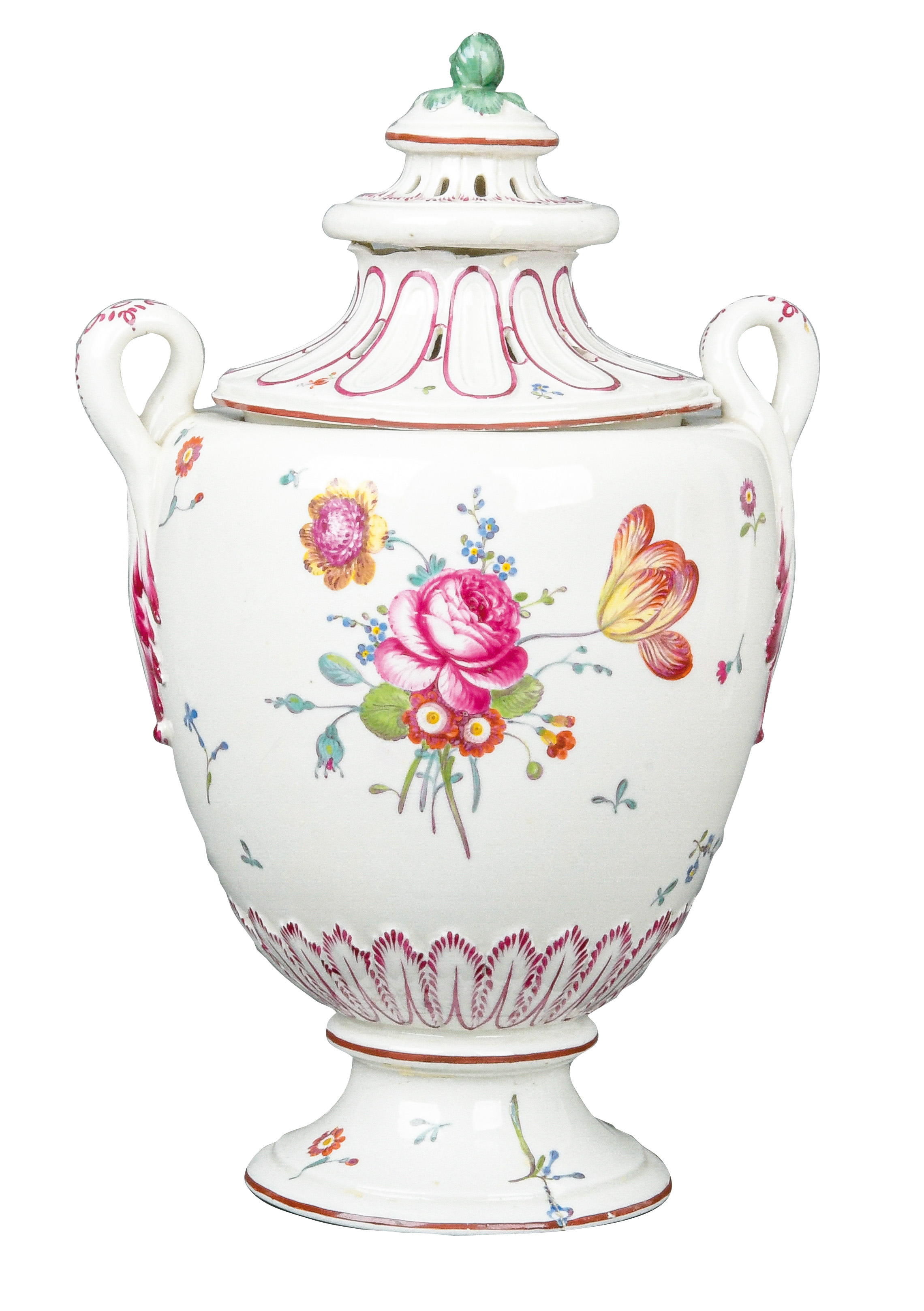 Eiförmig, auf eingeschnürtem, rundem Standfuß. Seitliche, erhöhte, durchbrochene, schlaufenförmige Henkel. Abgerundete Schultern mit darauf ruhendem, gestuftem und sich nach oben verjüngendem, durchbrochenem Deckel. Beide Schauseiten bunt bemalt mit Blumenbouquet, umgeben von Streublumen. Porzellan, am Boden unterglasurblaue, bekrönte, ligierte CT-Marke. Modell von Franz Conrad Linck. Vgl. C. L. Fuchs / F. Hepp, „Die Vasen der Manufaktur Frankenthal“, Aussstellungskatalog Kurpfälzisches Museum Heidelberg 2006, S. 70, Nr. 54 (das Gegenstück der hier gezeigten)