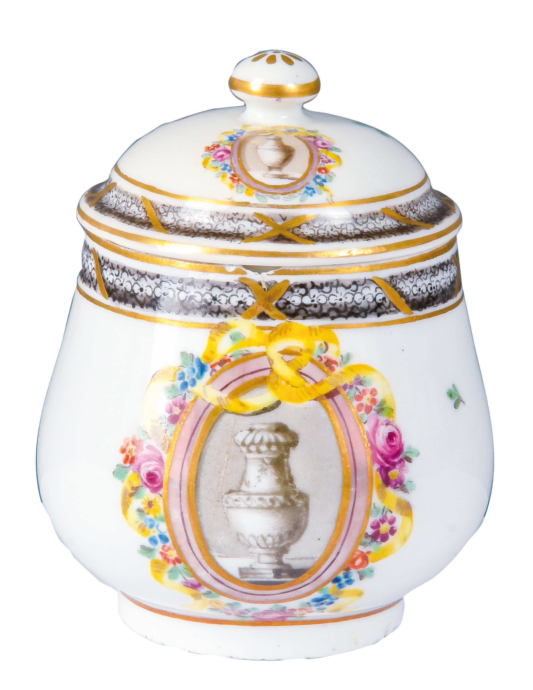 Balusterförmig, mit seitlichem Ohrhenkel. Leicht überstehender, gewölbter Deckel mit eingeschnürtem Knopfknauf. Ränder gesäumt von grau-schwarzer Blütenbordüre mit goldener Kreuzbandschnürung. Auf den Schauseiten jeweils ein ovales, rosafarben lüstrierendes Medaillon, gold gesäumt. Darin eine antikisierende Vase in Grisaillemalerei. Die Gesamtansicht ist gerahmt von bunt bemalten Blumengirlanden, geschnürt mit gelbem Band. Freiräume bunt bemalt mit Streublumen. Porzellan, am Boden unterglasurblaue, bekrönte, ligierte CT-Marke, REM Sammlungs-No. 000086. Provenienz: Auktionshaus Hahn, Frankfurt März 1925. Von den insgesamt 260 Teilen wurden nur insgesamt 30 Crèmetöpfchen für die Silberkammer produziert. Und von diesem Tafelservice existieren heute nur noch 37 Teile. Vgl. B. Beaucamp-Markowsky, S. 157, Nr. 71, id. abgebildet. (Haarriss in der Wandung, min. best.)