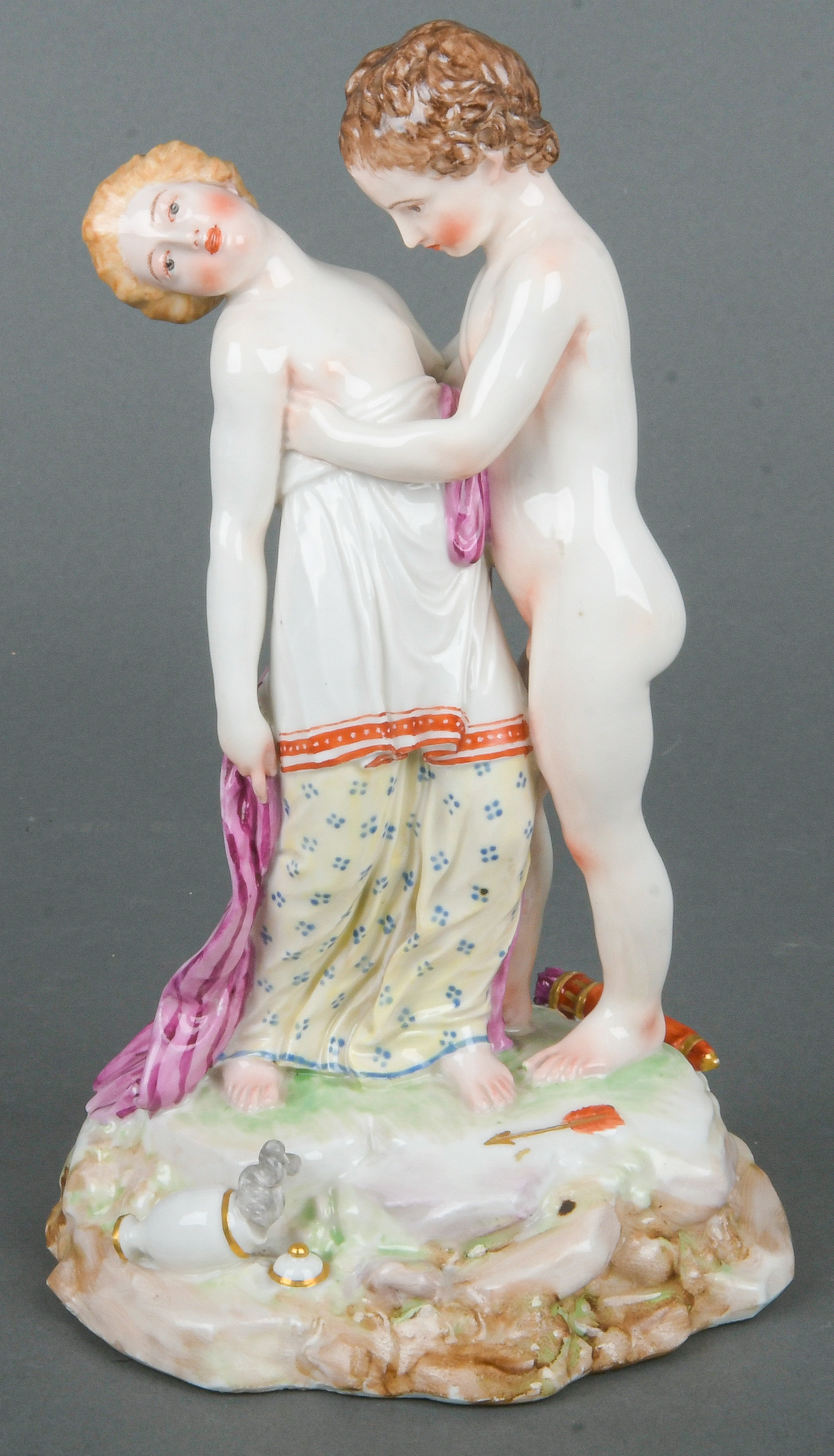 Je stehend, spärlich bekleidet, auf ovalem Felssockel. Darauf ein Köcher mit Pfeilen, ein Pfeil und eine Vase mit Rauchwolke. Porzellan, weiß glasiert, am Boden unterglasurblaue, bekrönte, ligierte CT-Marke mit einem Punkt, REM Sammlungs-No. 000003. Modell von Johann Peter Melchior. Provenienz: Erworben bei der Versteigerung der Sammlung des Freiherrn von Venningen, Eichtersheim, bei Nagel, Mannheim 1909. Vgl. B. Beaucamp-Markowsky, S. 564ff, Nr. 308ff.