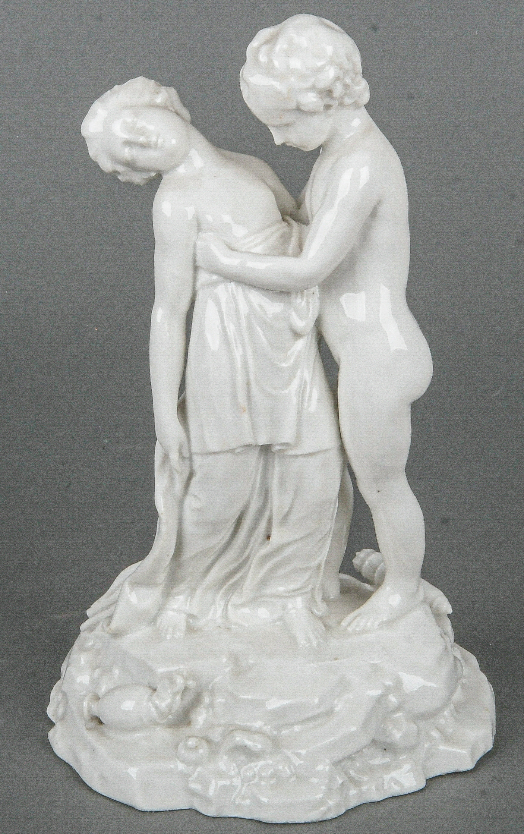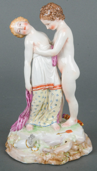 Auf ovalem, felsigem Sockel stehend bzw. sitzend. Porzellan, weiß glasiert, am Boden unterglasurblaue, bekrönte, ligierte CT-Marke mit Ritzzeichen „No2“ und „W“, REM Sammlungs-No. 002226. Modell von Johann Peter Melchior. Vgl. C. T. Hofmann, Taf. 142, Nr. 574.