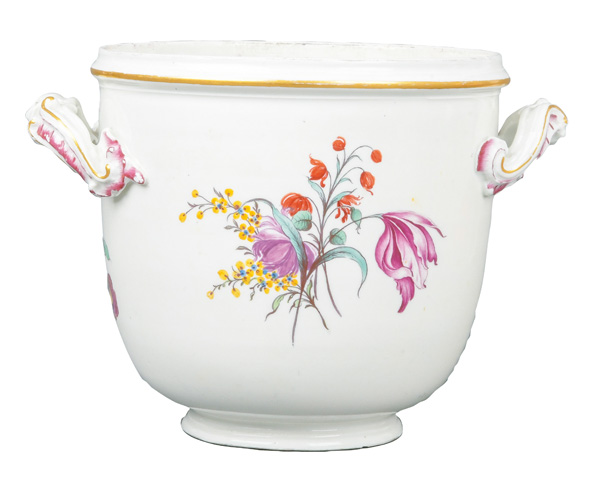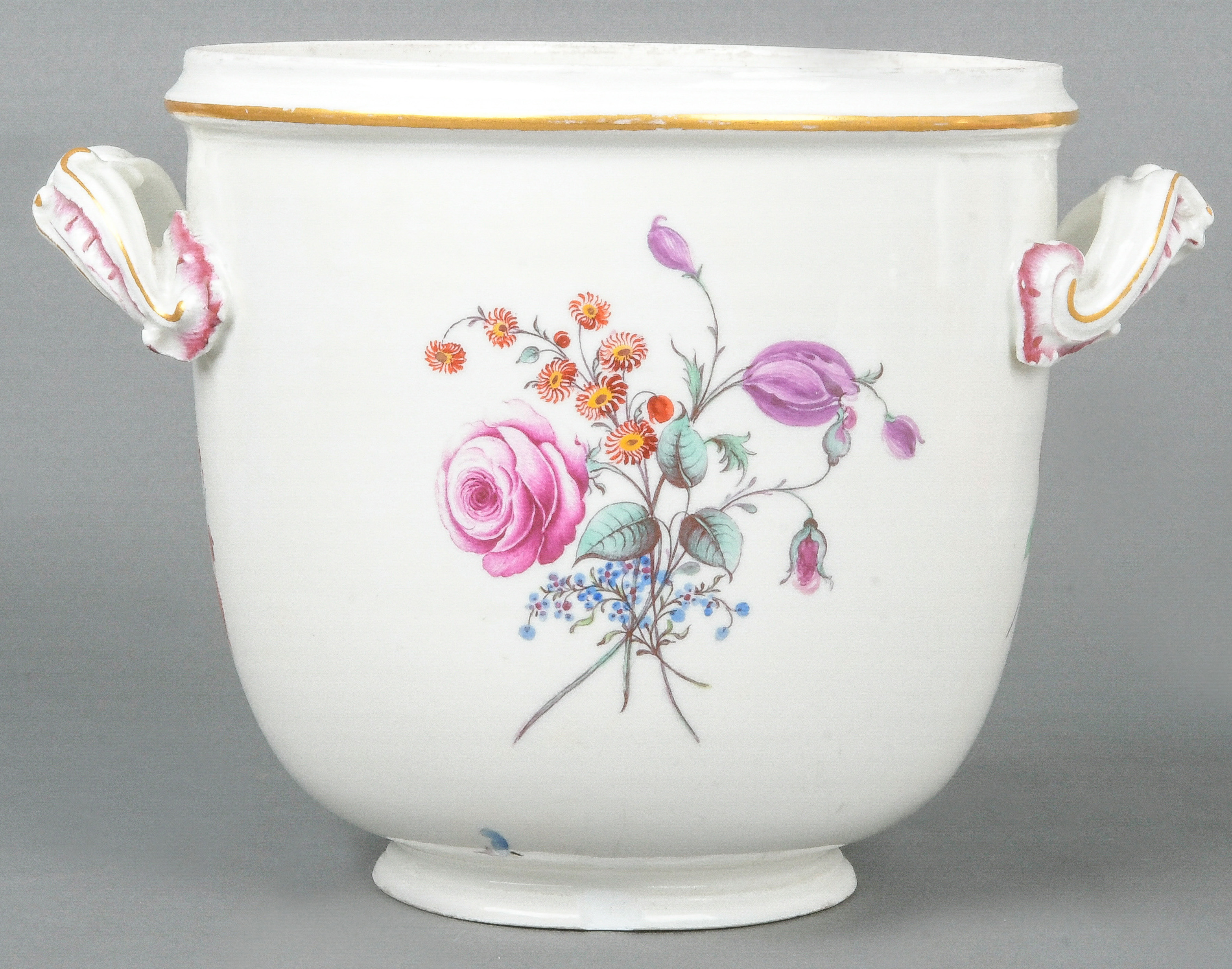 Walzenförmig, auf eingeschnürtem Standring. Wulstiger, gold gesäumter Lippenrand. Seitlich als durchbrochene Rocaillen modellierte Henkel. Schauseiten bunt bemalt mit Blumenbouquet, umgeben von Streublumen. Porzellan, am Boden unterglasurblaue, steigende Löwenmarke.
